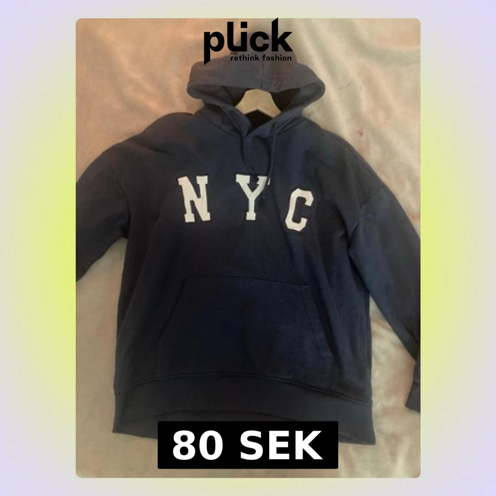 En mysig marinblå hoddie i storlek m, där det står NYC.