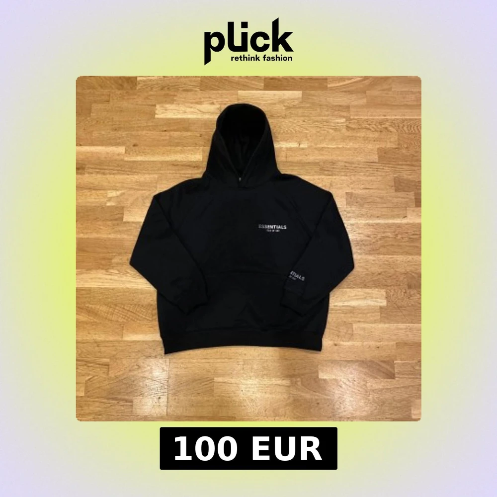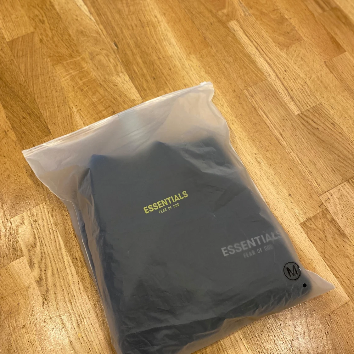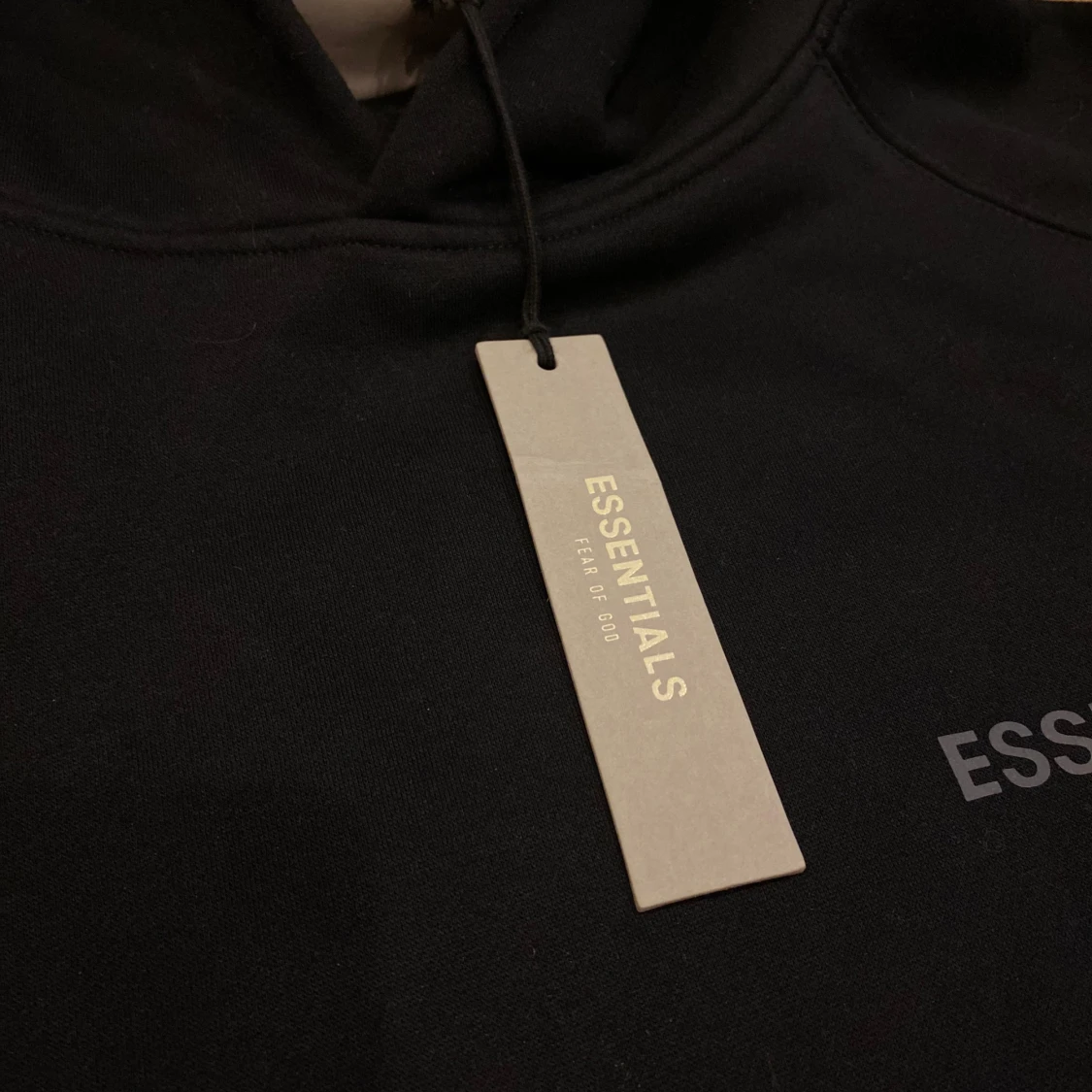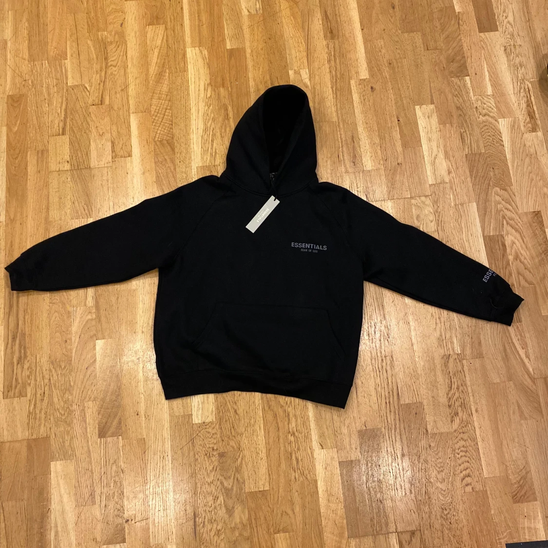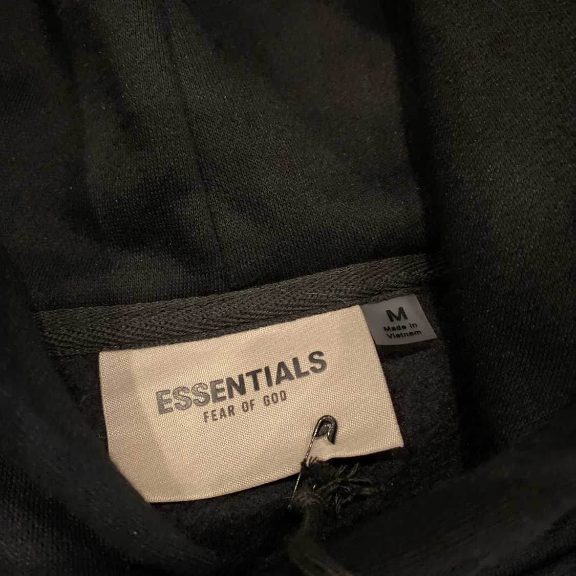 Svart hoodie från Essentials Fear of God i storlek M. Klassisk oversized passform med huva och känguruficka. Diskret logga på bröstet och ärmen. Mjuk bomullsblandning som passar perfekt till streetwear-stilen.