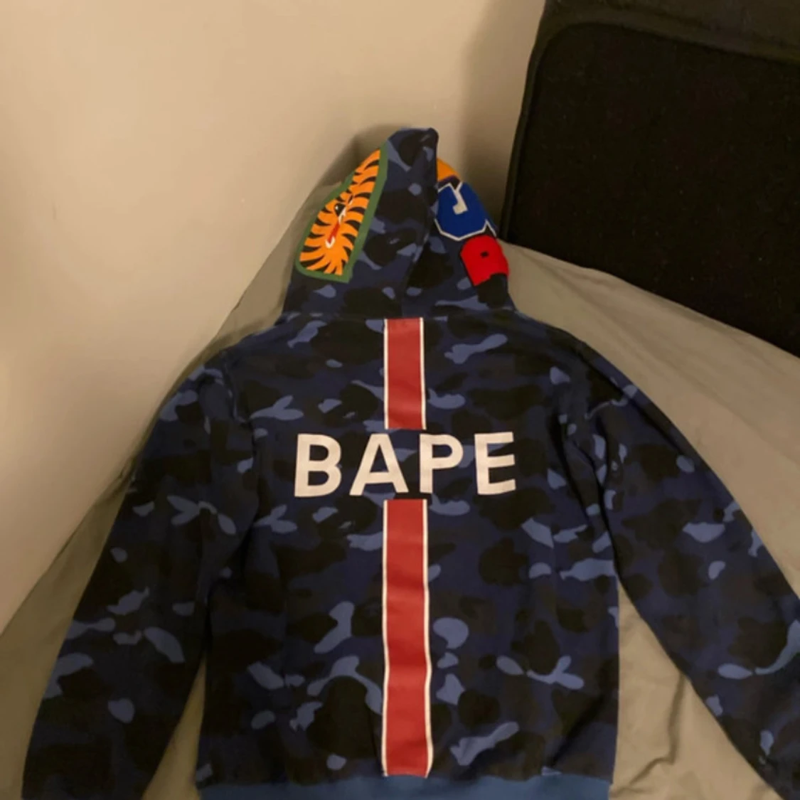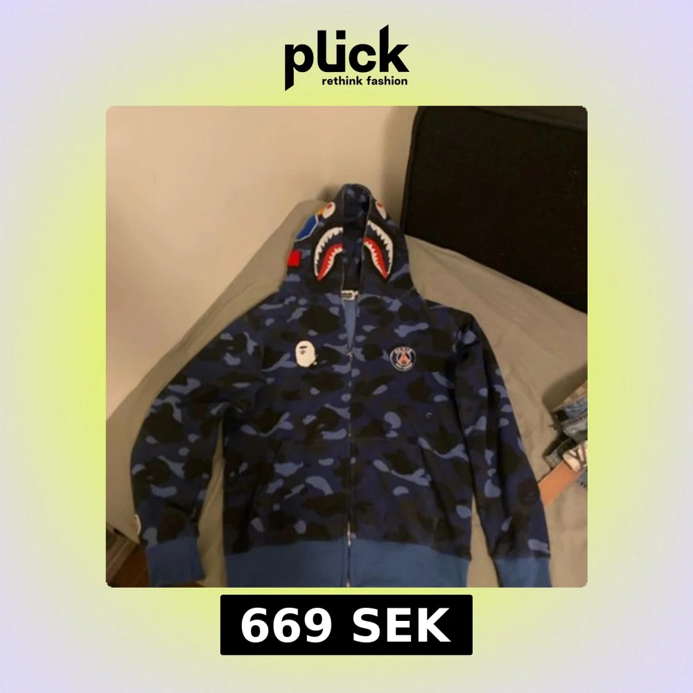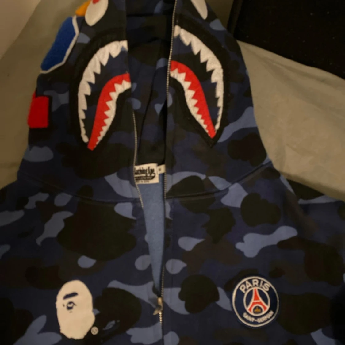 Säljer en cool blå camo hoodie från BAPE och Psg köpt för 1149 Använd 3 gånger Storlek M