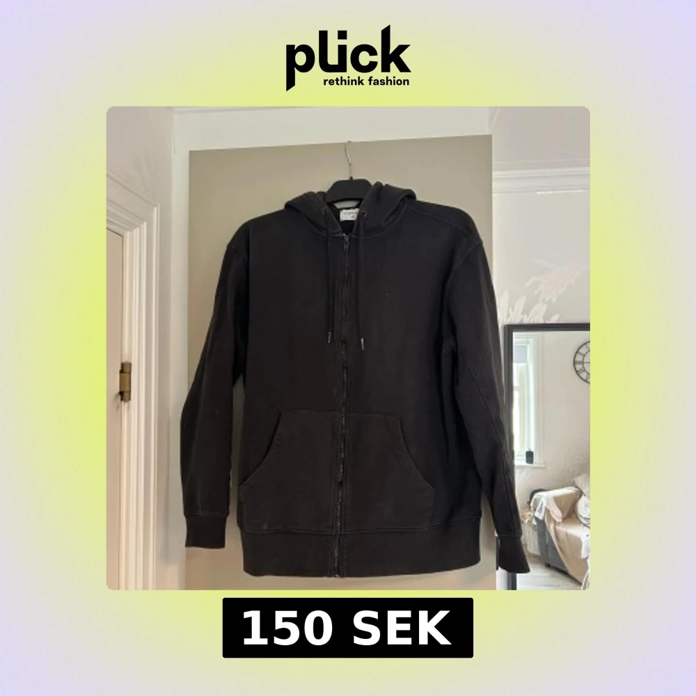 Säljer en svart hoodie från Studio Total i storlek M. Den har dragkedja framtill och en praktisk huva med snörning. Perfekt för en avslappnad stil.
