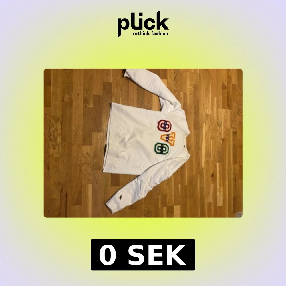 Lägg bud Säljer en vit sweatshirt från OVO med broderade patches i rött, gult och grönt framtill. Tröjan har lång ärm och klassisk passform. Tillverkad i mjuk bomull och har OVO:s ikoniska ugglelogga på ärmen. Perfekt för dig som gillar streetwear med färg.
