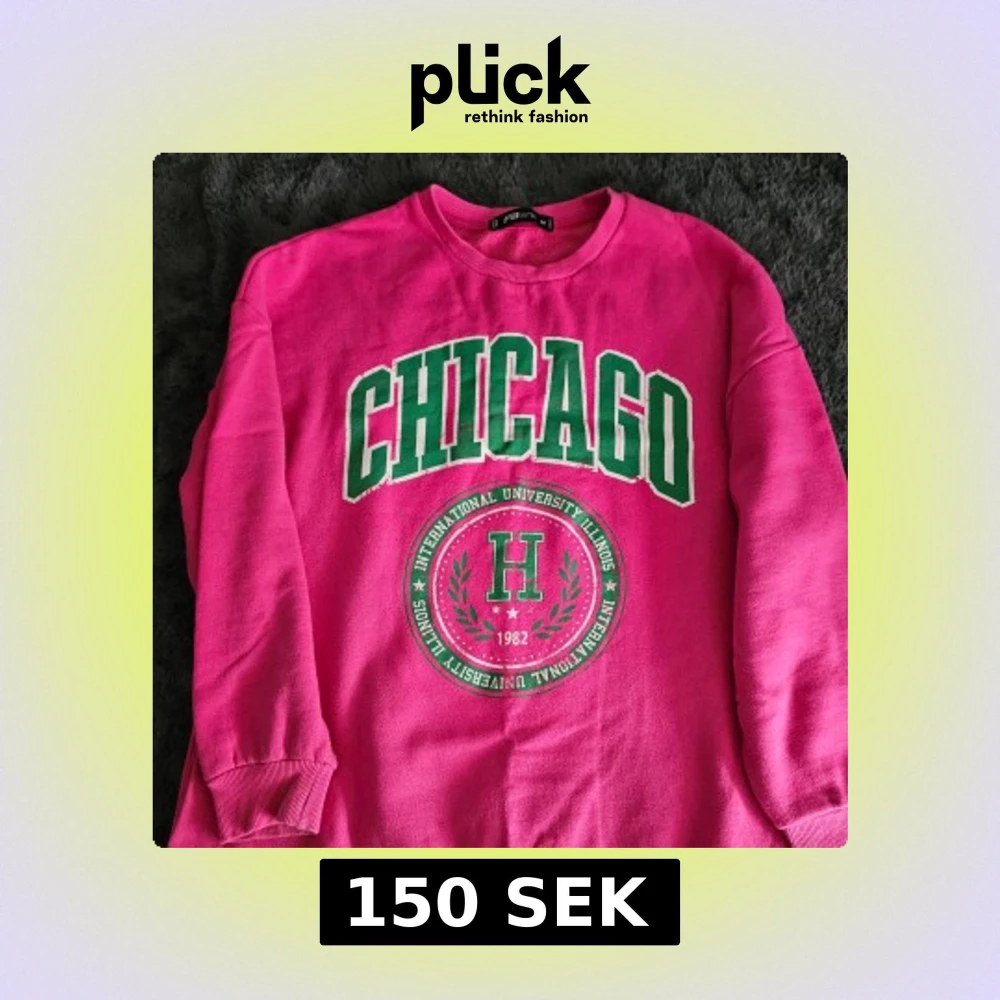 Säljer en cool rosa sweatshirt med stort grönt 'CHICAGO' tryck på framsidan. Tröjan har långa ärmar och rund halsringning. Perfekt för en avslappnad stil.