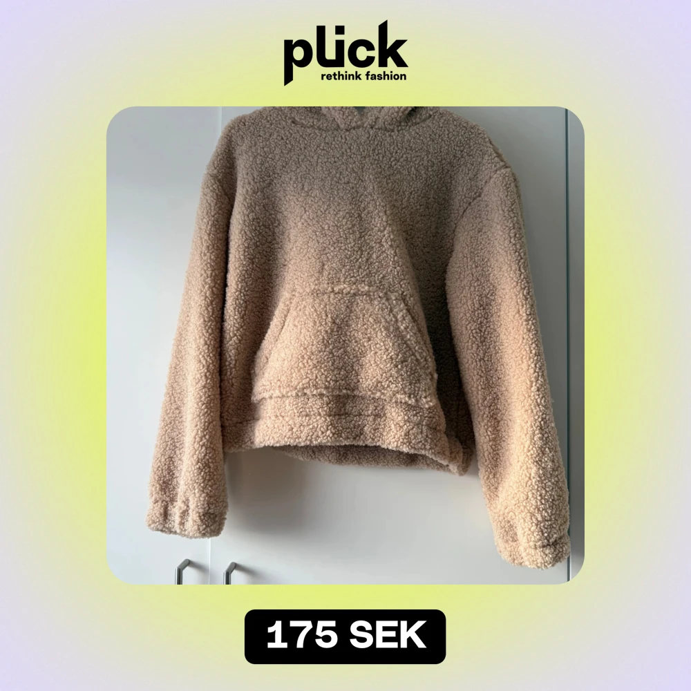 Mysig beige hoodie i fleece-material som är perfekt för kyliga dagar. Den har en stor ficka framtill och en bekväm huva. Tröjan är i bra skick och passar perfekt för höst och vinter.