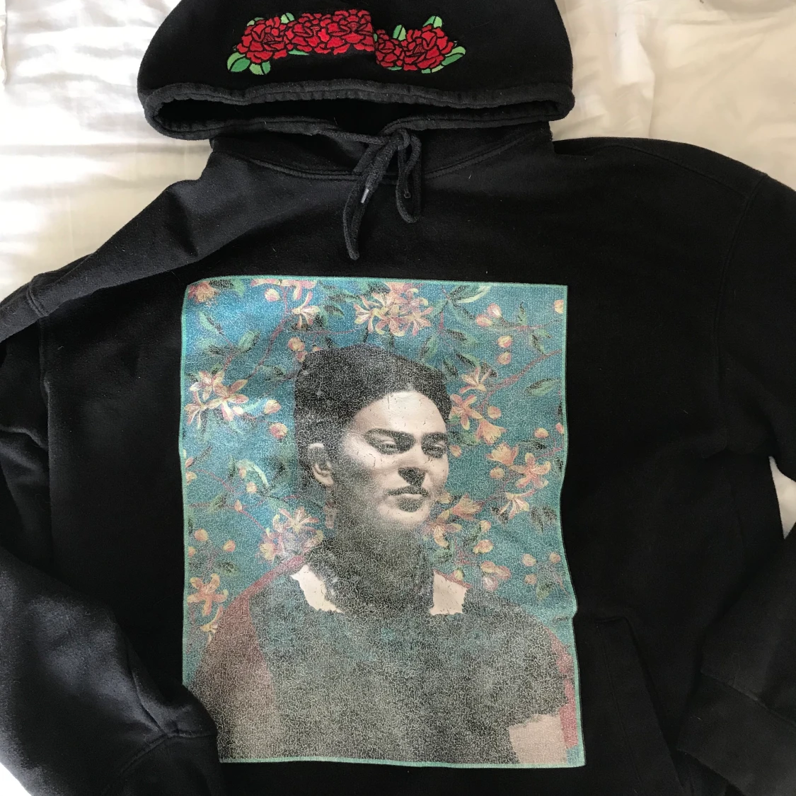 supercool svart hoodie med frida kahlo tryck. i bra skick!