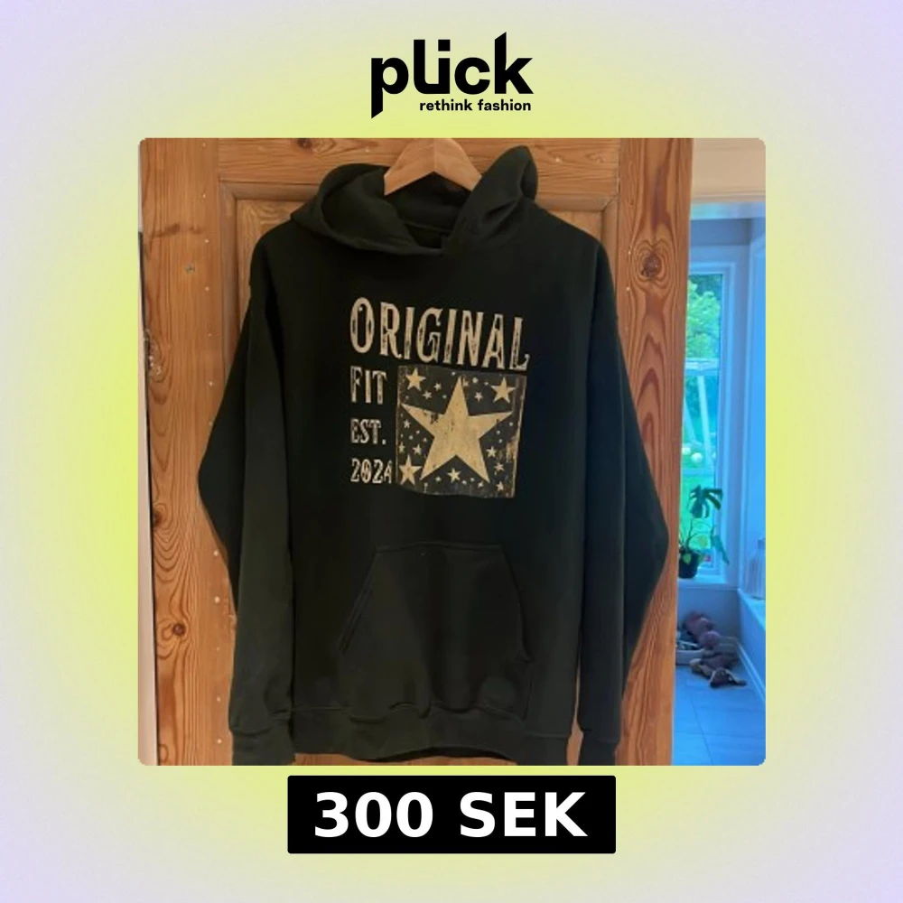 Grön hoodie köpt från hemsidan scndi märket gildan med stor vit stjärna och texten 'ORIGINAL FIT EST. 2024' framtill. Klassisk känguruficka, huva och långa ärmar. Använd endast fåtal gånger.