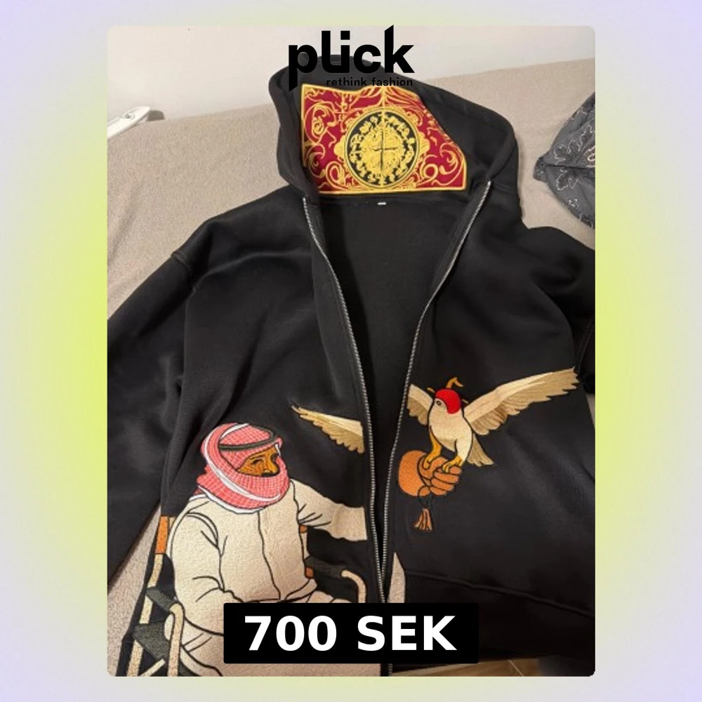 Unik svart hoodie med dragkedja och huva, dekorerad med broderade motiv av en man i traditionell klädsel och en fågel. Insidan av huvan har ett färgstarkt mönster i rött, gult och svart. Perfekt för dig som gillar statement-plagg och detaljerad design.