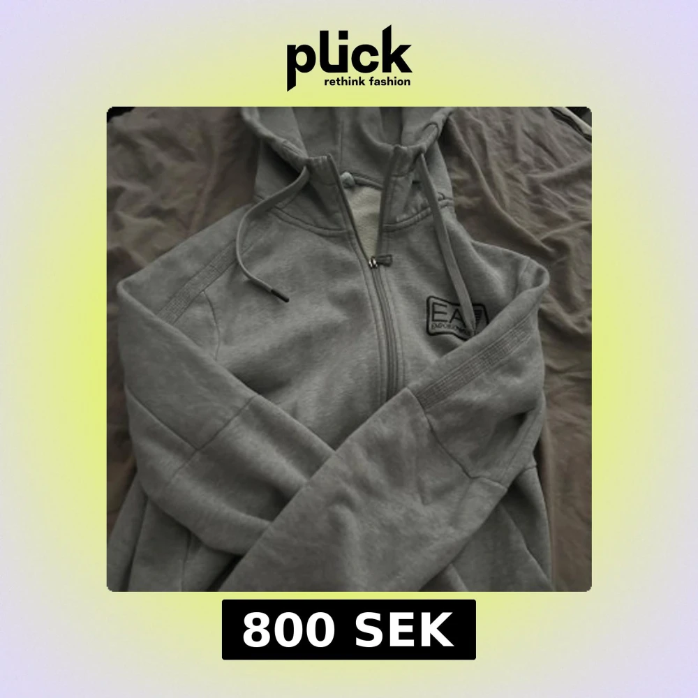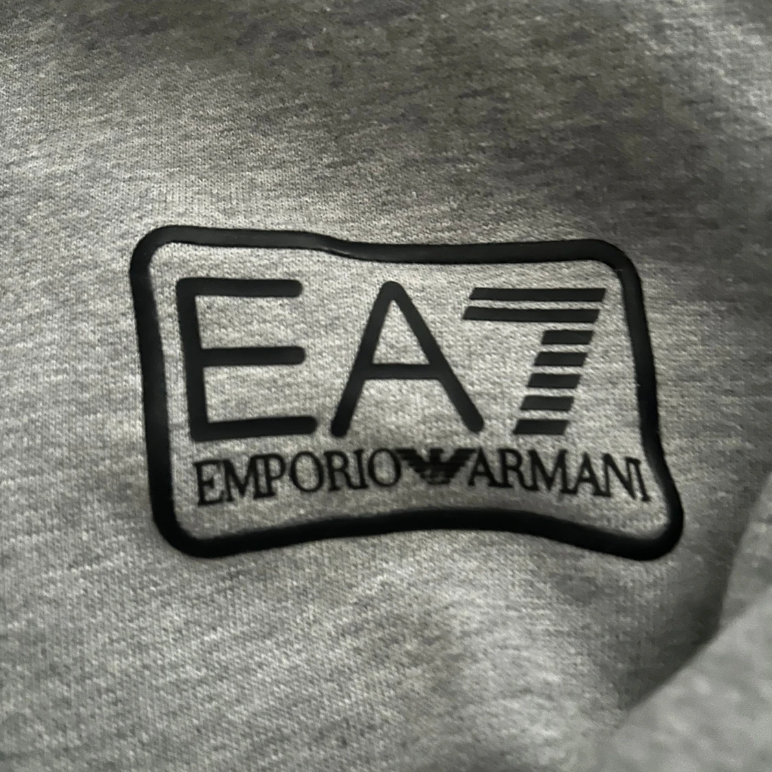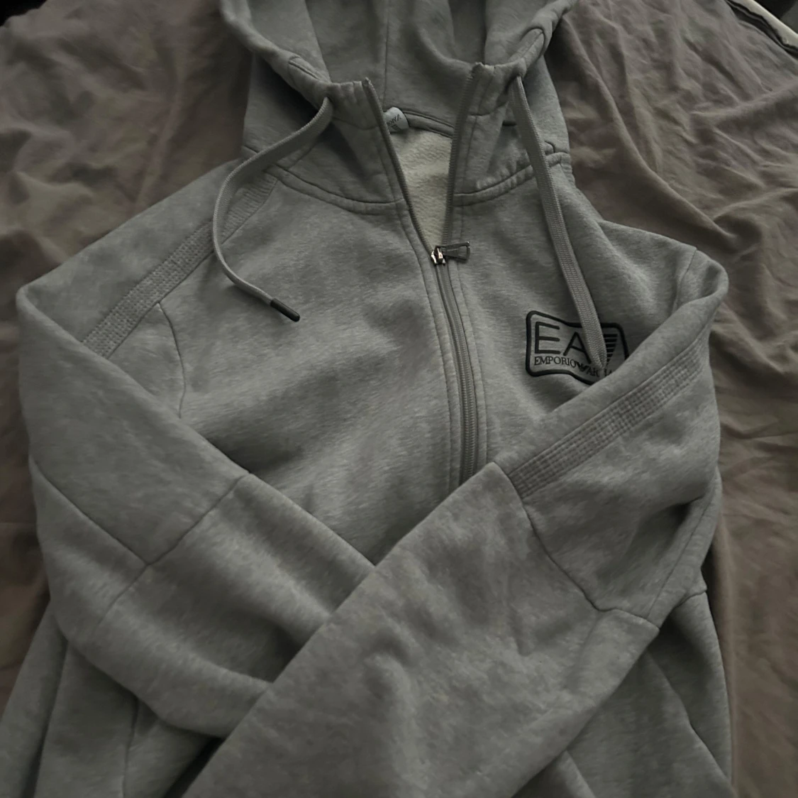 Säljer en grå hoodie från EA7 Emporio Armani med dragkedja och huva. Jackan har lång ärm, ribbade muddar och en stilren logga på bröstet. Perfekt för en avslappnad och sportig look. Nypris 1899 jag säljer nu den för runt 800kr