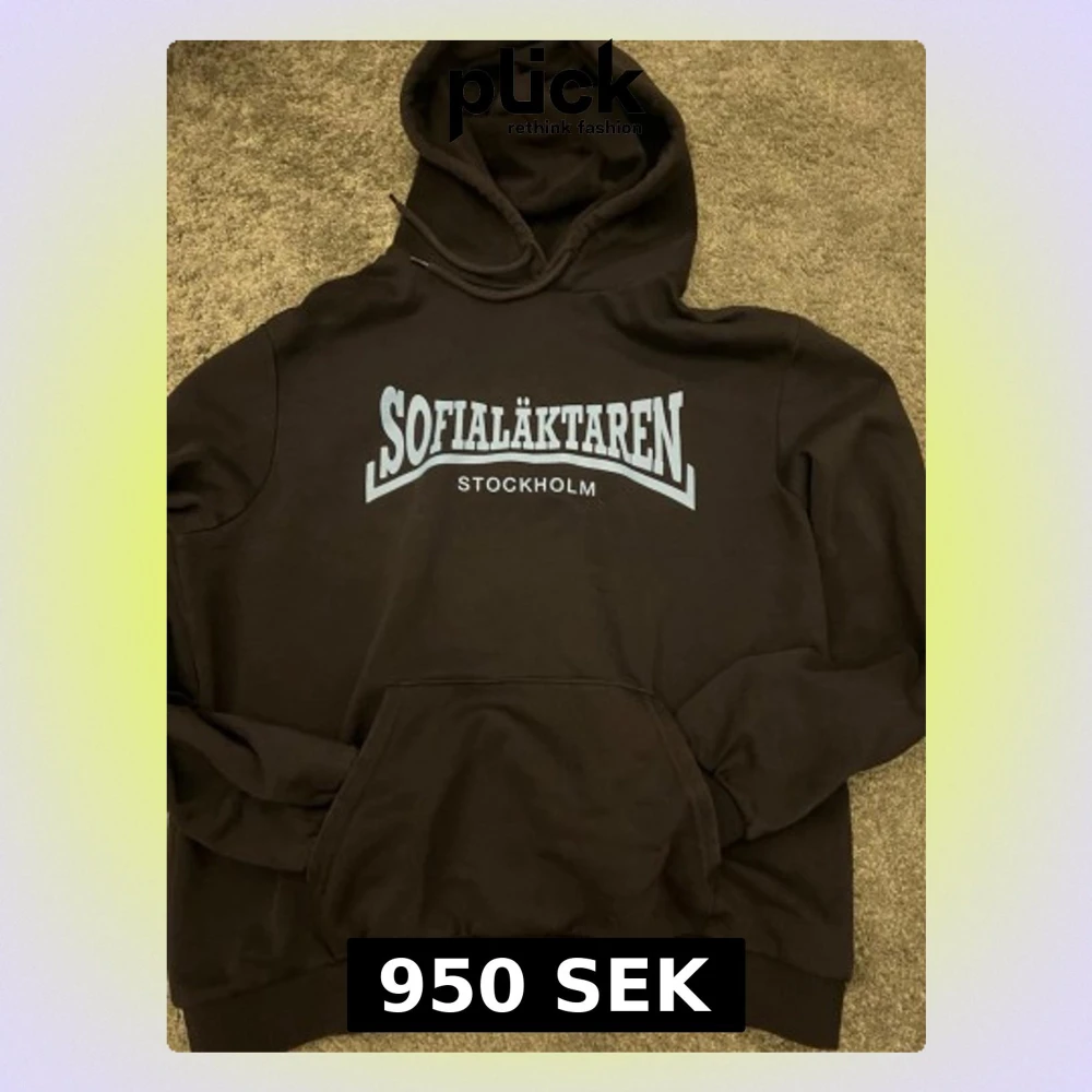 Säljer en svart hoodie från Sofialäktaren med stor vit text på bröstet och 'Stockholm' under. Klassisk känguruficka framtill och justerbar huva med snören. Perfekt för dig som vill representera Stockholm och gillar en avslappnad streetwear-stil.