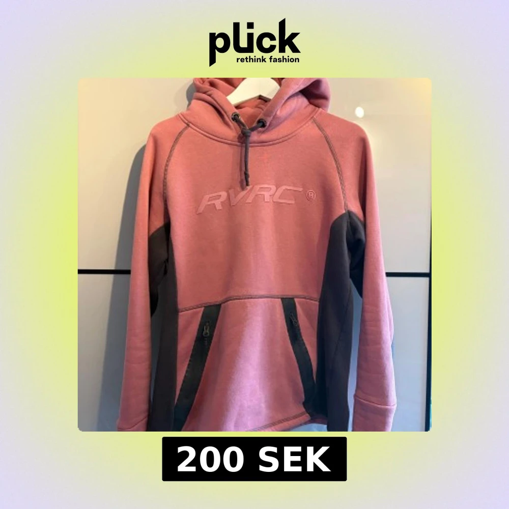 Säljer en rosa hoodie från RevolutionRace med mörkgrå detaljer längs sidorna och ärmarna och ficka med dragkedja framtill.