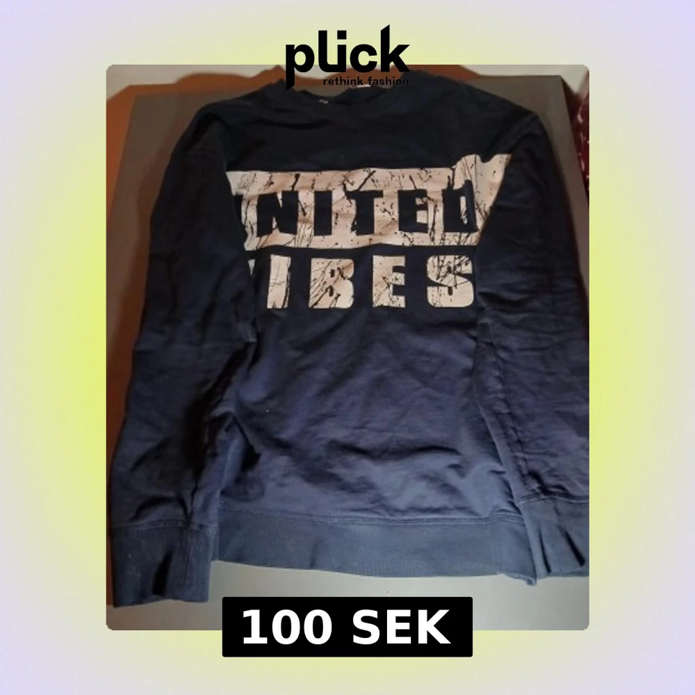 Säljer en mörkblå sweatshirt med stort vitt tryck på bröstet där det står 'UNITED VIBES' med coolt spräckligt mönster. Tröjan har långa ärmar och ribbade muddar vid ärmslut och nederkant. Perfekt för en chill och avslappnad stil.