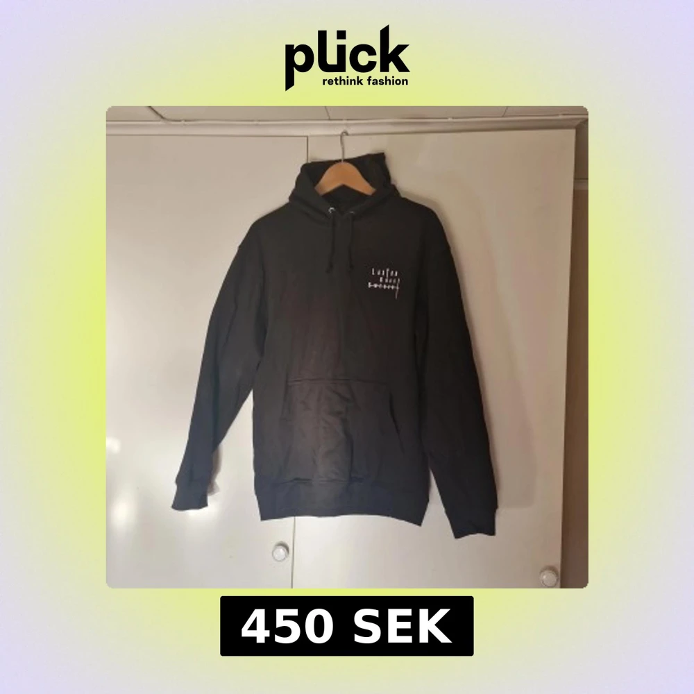 Säljer en svart hoodie med tryck både fram och bak av Laxton. Den har en stor ficka framtill och justerbar huva med dragsko. Perfekt för en avslappnad stil. Aldrig använt