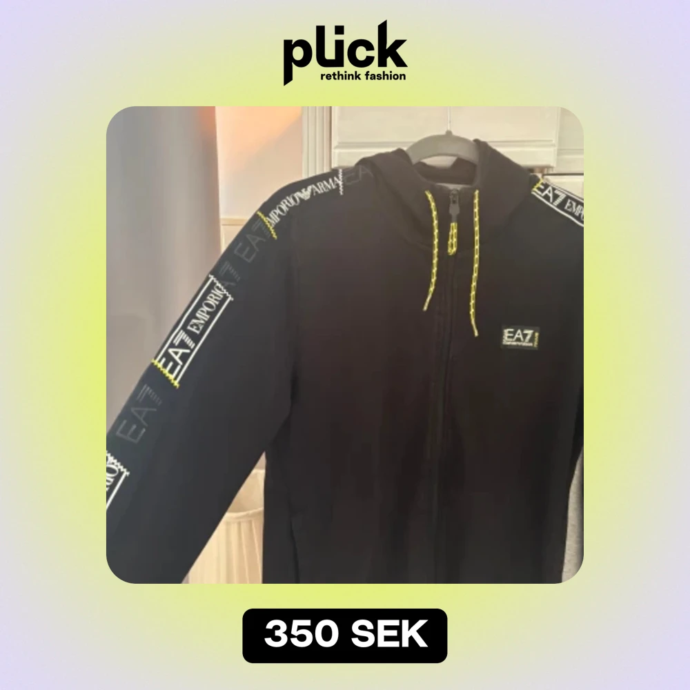 En svart jacka från Emporio Armani med dragkedja och huva. Jackan har gula detaljer och logotypen 'EA7' tryckt på bröstet samt längs ärmarna.