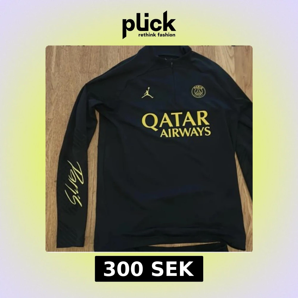 Säljer en svart långärmad PSG träningströja med gul text och logga. Tröjan har halv dragkedja, Jordan-logga och Paris Saint-Germain-märke på bröstet samt Qatar Airways som sponsor. Snygg detalj med 'Paris' på ärmen.