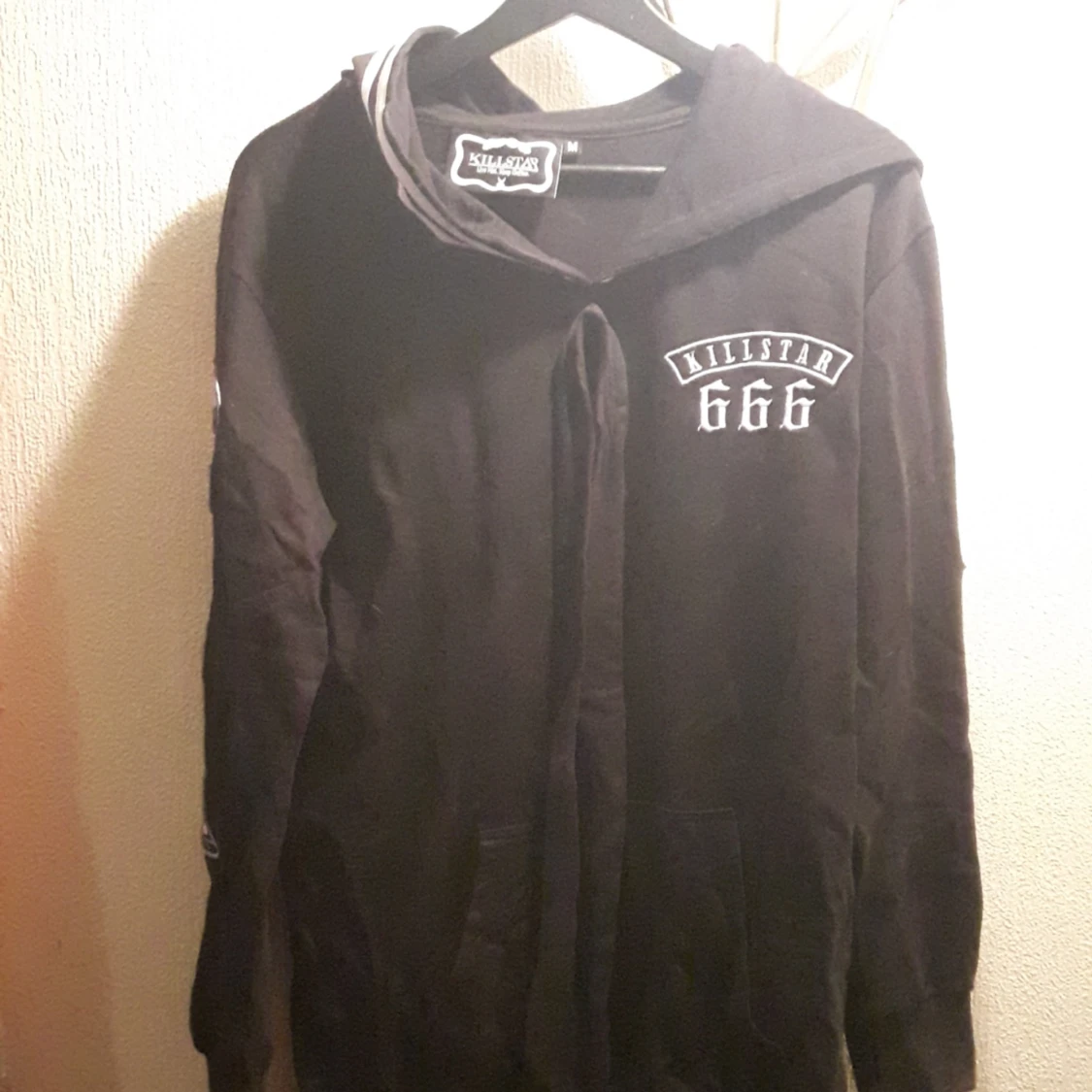 Hood från Killstar! Använd en endast en gång. Flera patches på armarna. Luva och snörning som slips eller rosett. 💜 Frakt tillkommer vid köp!