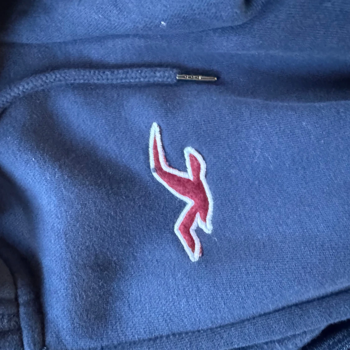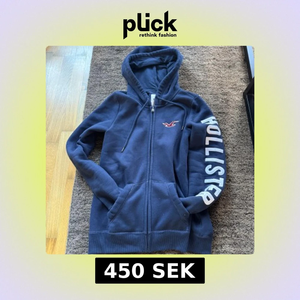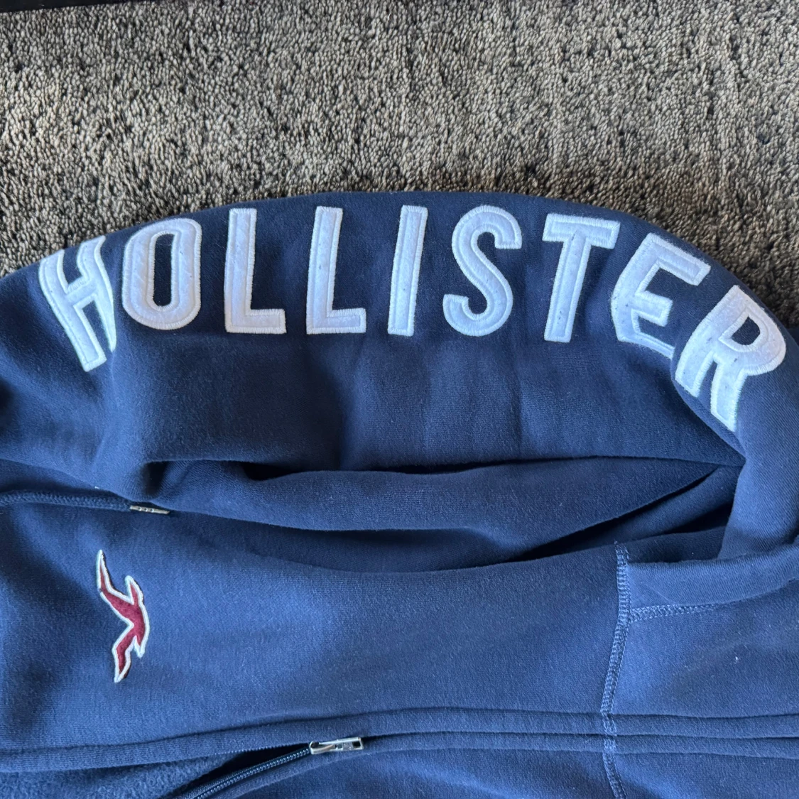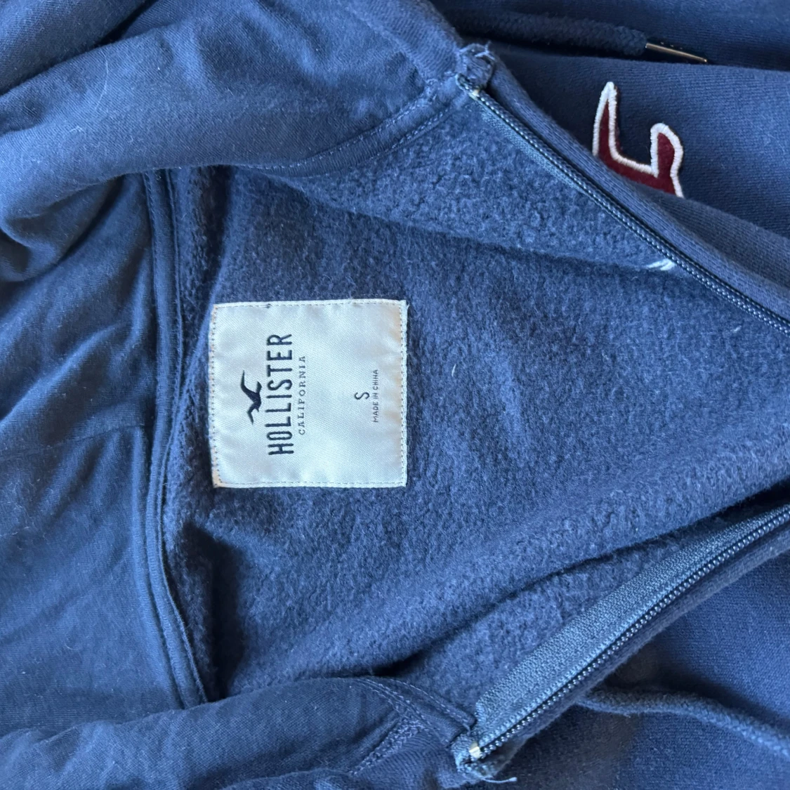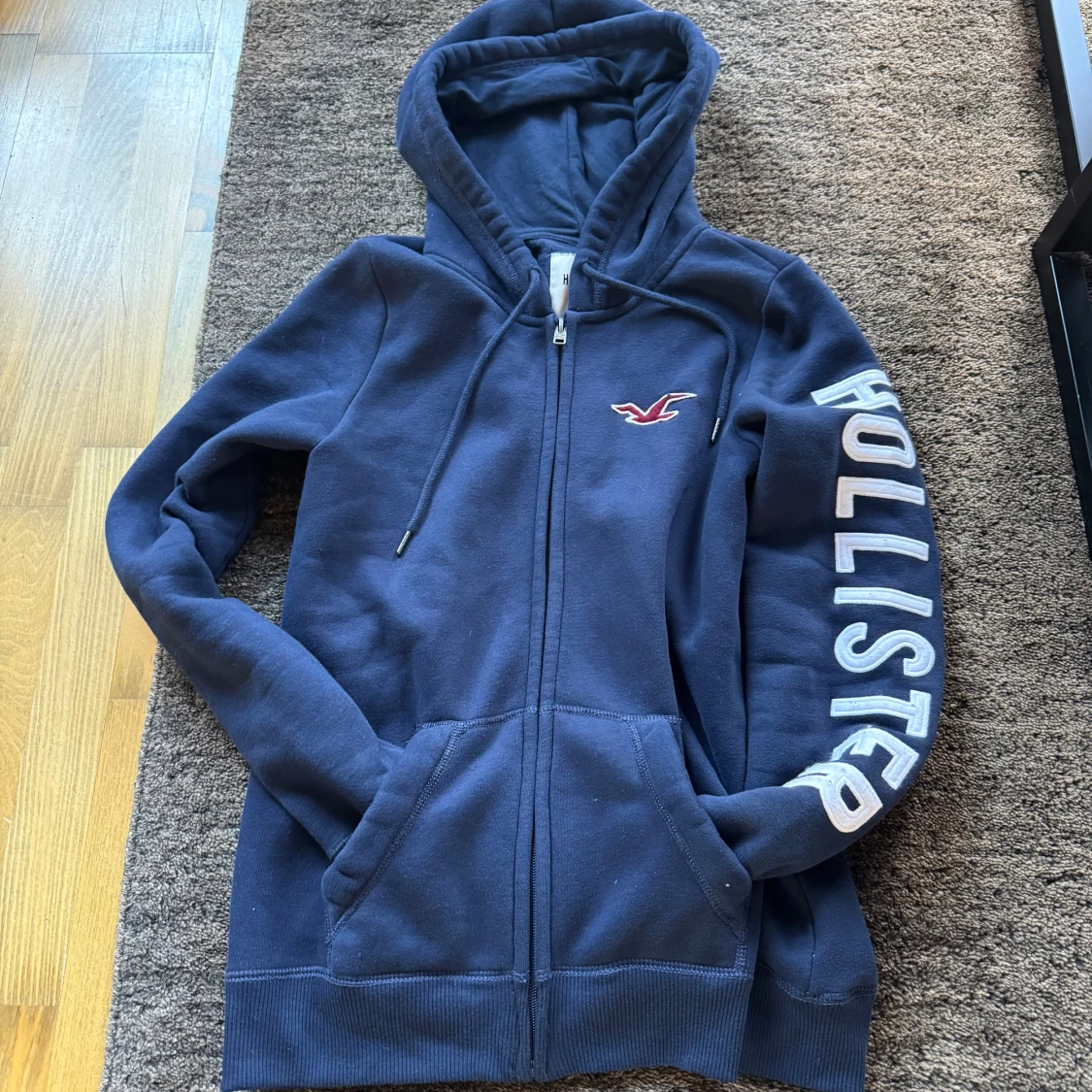 Marinblå hoodie från Hollister med dragkedja, stor vit logga på ena ärmen och broderad röd fågel på bröstet. Tröjan har huva med snörning och två stora fickor framtill. Passar typ de i 175-185. Är i bra kondition förutom att texten på armen typ ser lite använd men det kan man fixa enkelt med en maskin. Priset är ej satt i sten