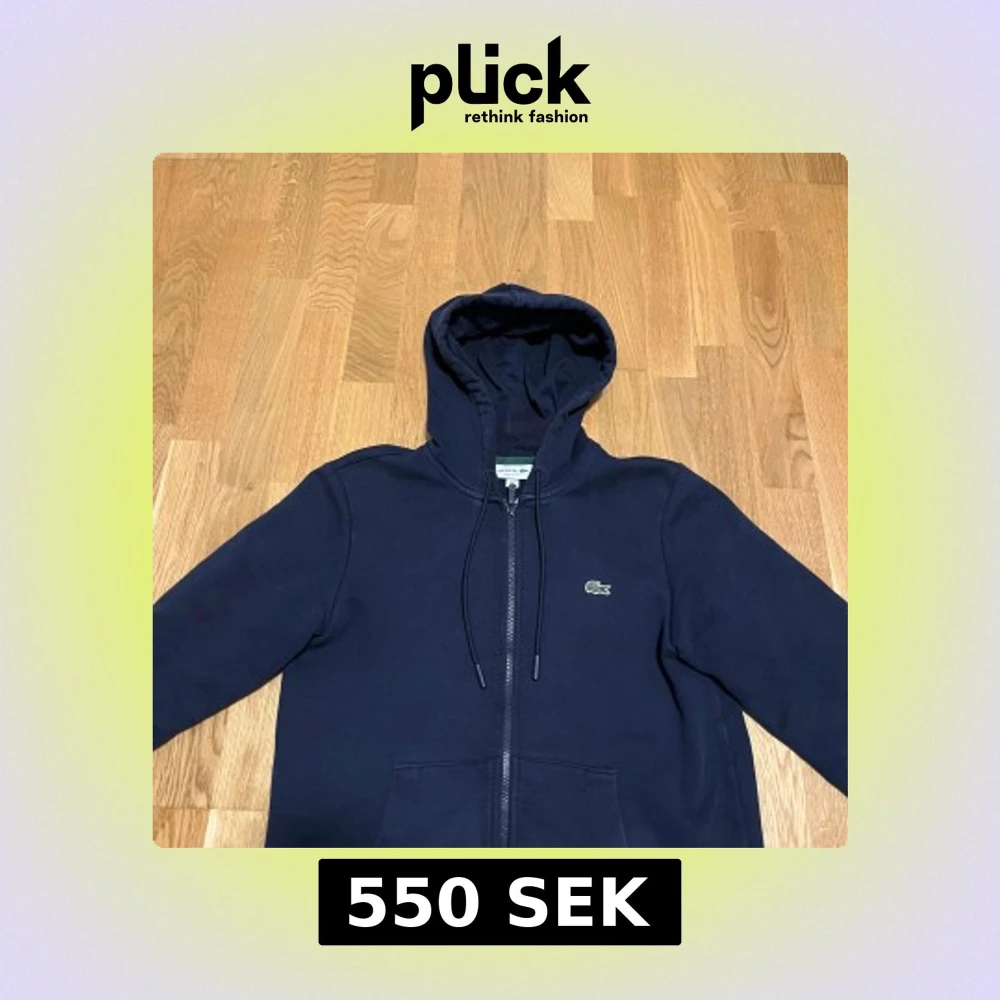 Snygg marinblå hoodie från Lacoste med dragkedja och klassisk krokodillogga på bröstet. Tröjan har huva med snörning, långa ärmar och två fickor framtill. Perfekt för dig som gillar stilren och sportig look. Ny pris 1800kr köpte den på Åhléns