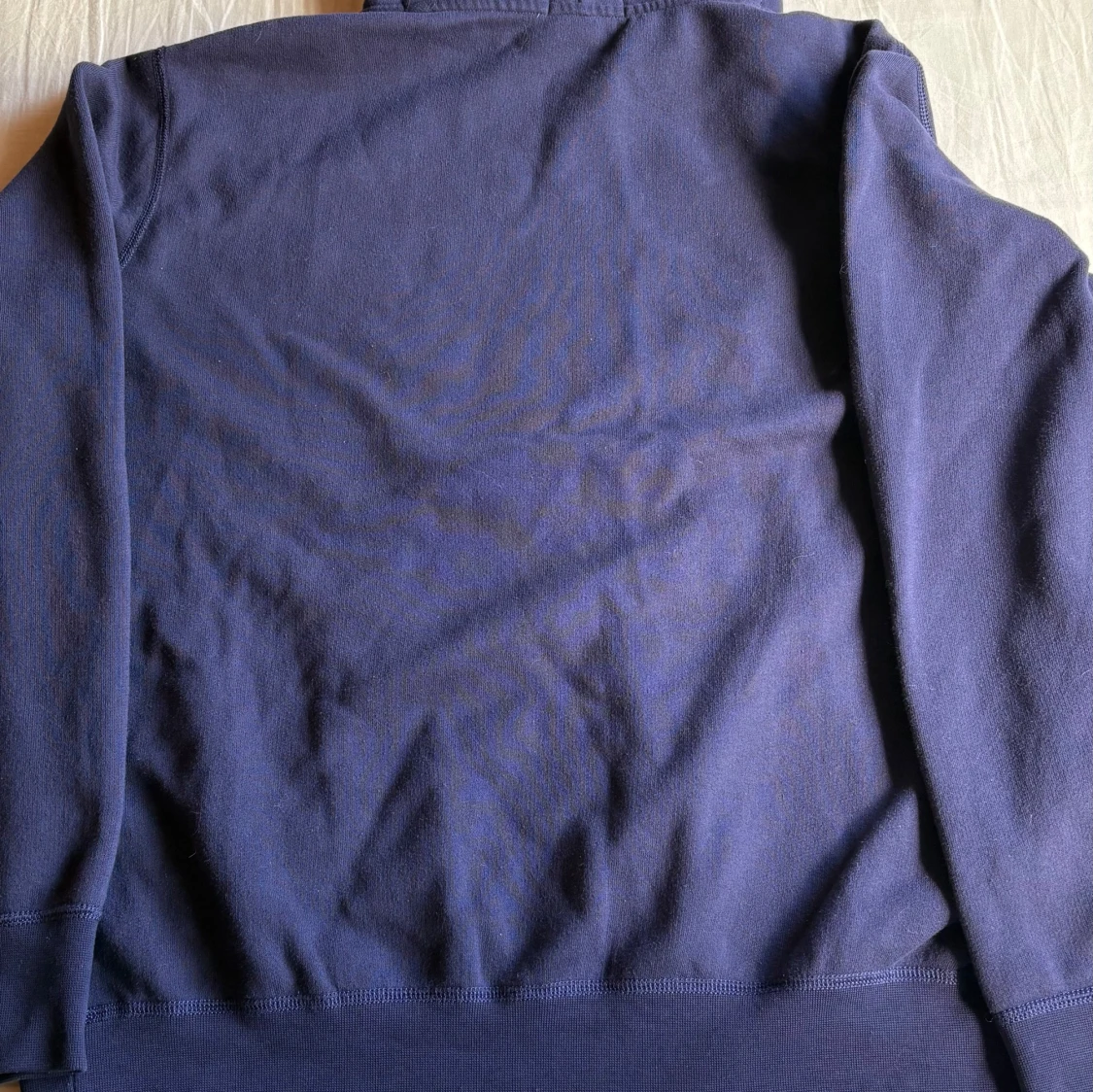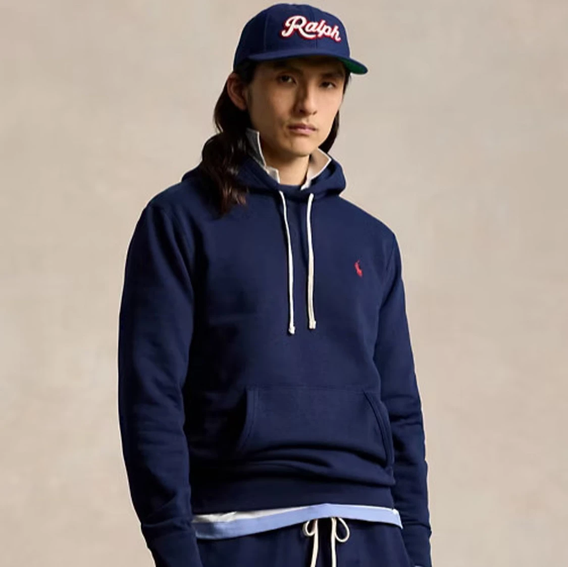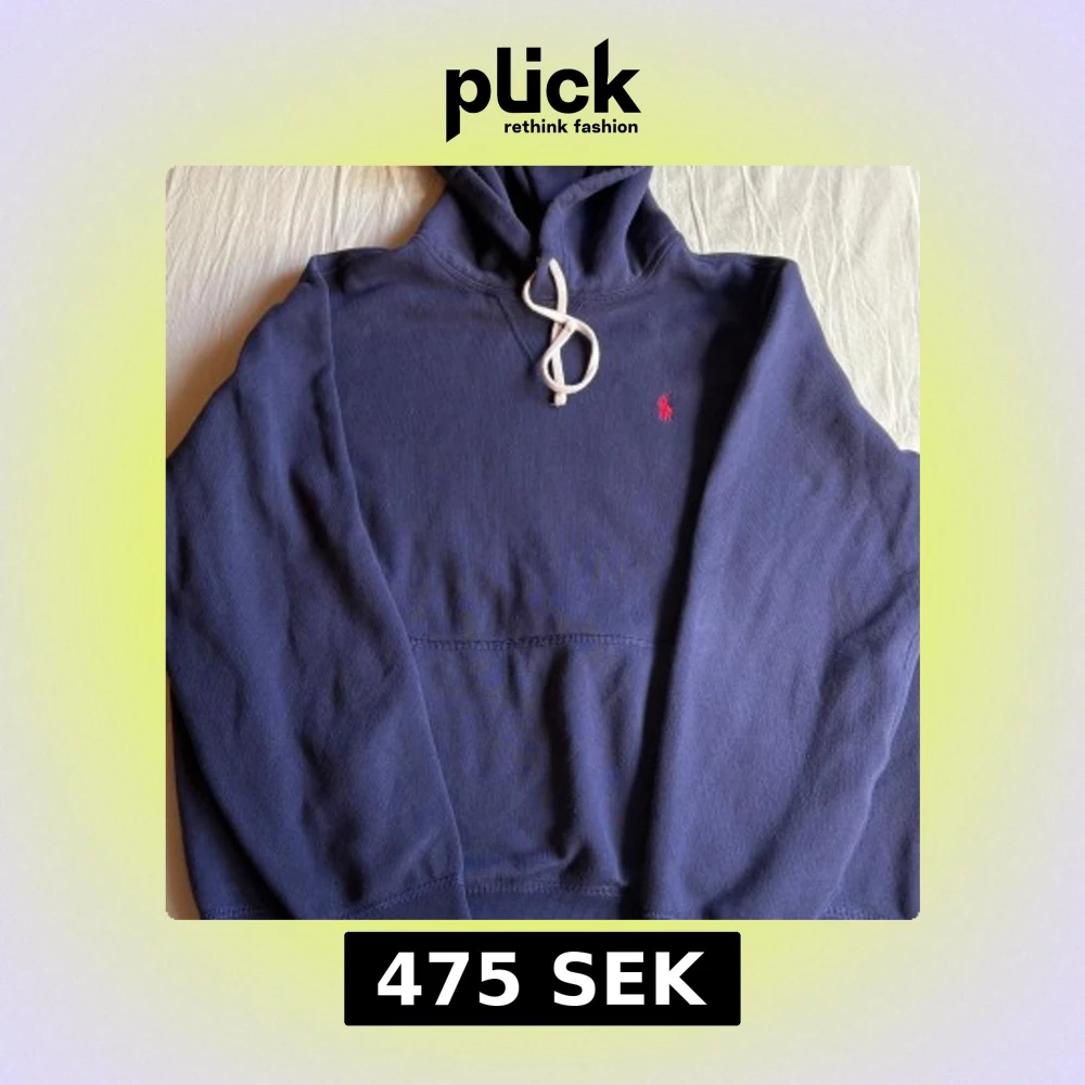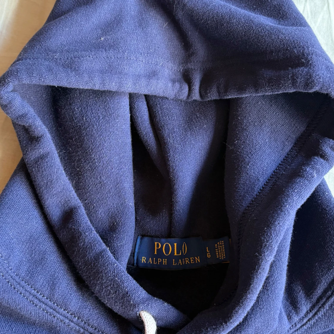 Säljer en marinblå hoodie från Polo Ralph Lauren med vit snörning och klassisk röd logga broderad på bröstet. Tröjan har huva, känguruficka och långa ärmar. Perfekt för dig som gillar stilren och avslappnad look.