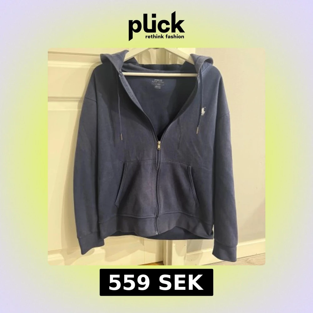 Säljer en marinblå hoodie från Polo Ralph Lauren med dragkedja och huva. Klassisk broderad logga på bröstet, fickor framtill och snörning i huvan. Perfekt för chill dagar eller när du vill ha en stilren look.
