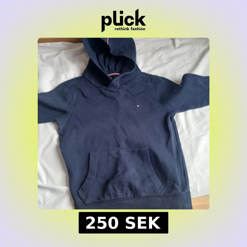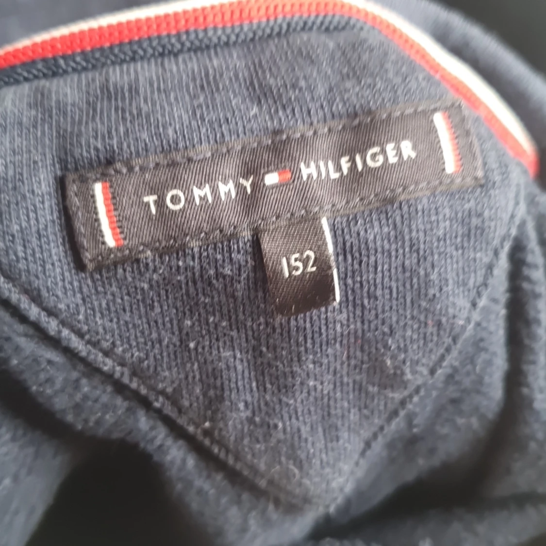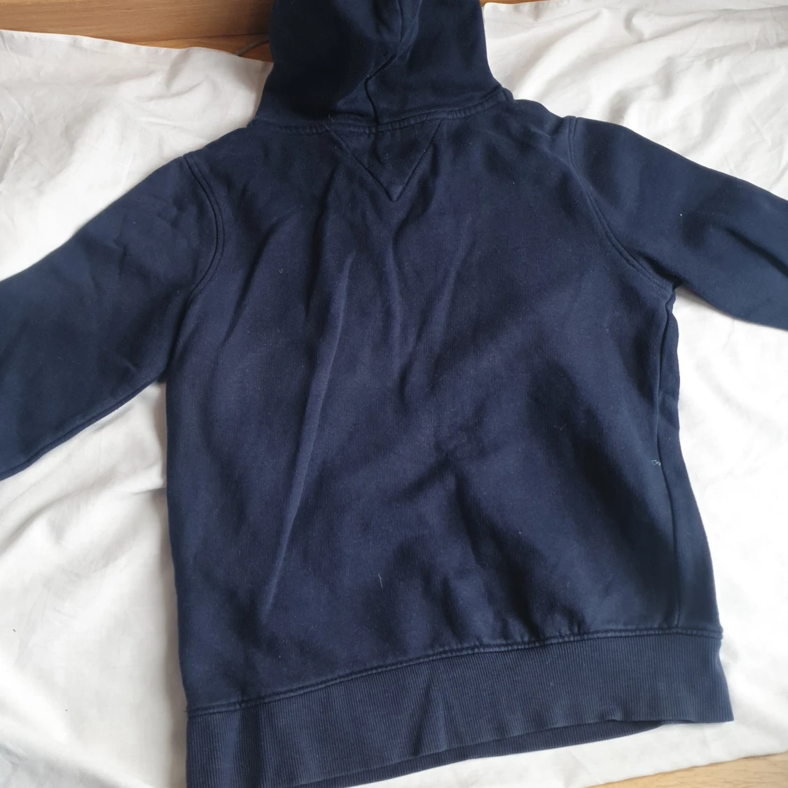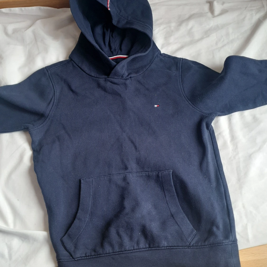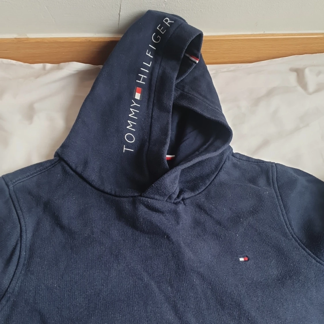 Säljer en marinblå hoodie från Tommy Hilfiger med klassisk logga på bröstet och tryck på huvan. Tröjan har känguruficka och ribbade muddar. Perfekt för en avslappnad stil.