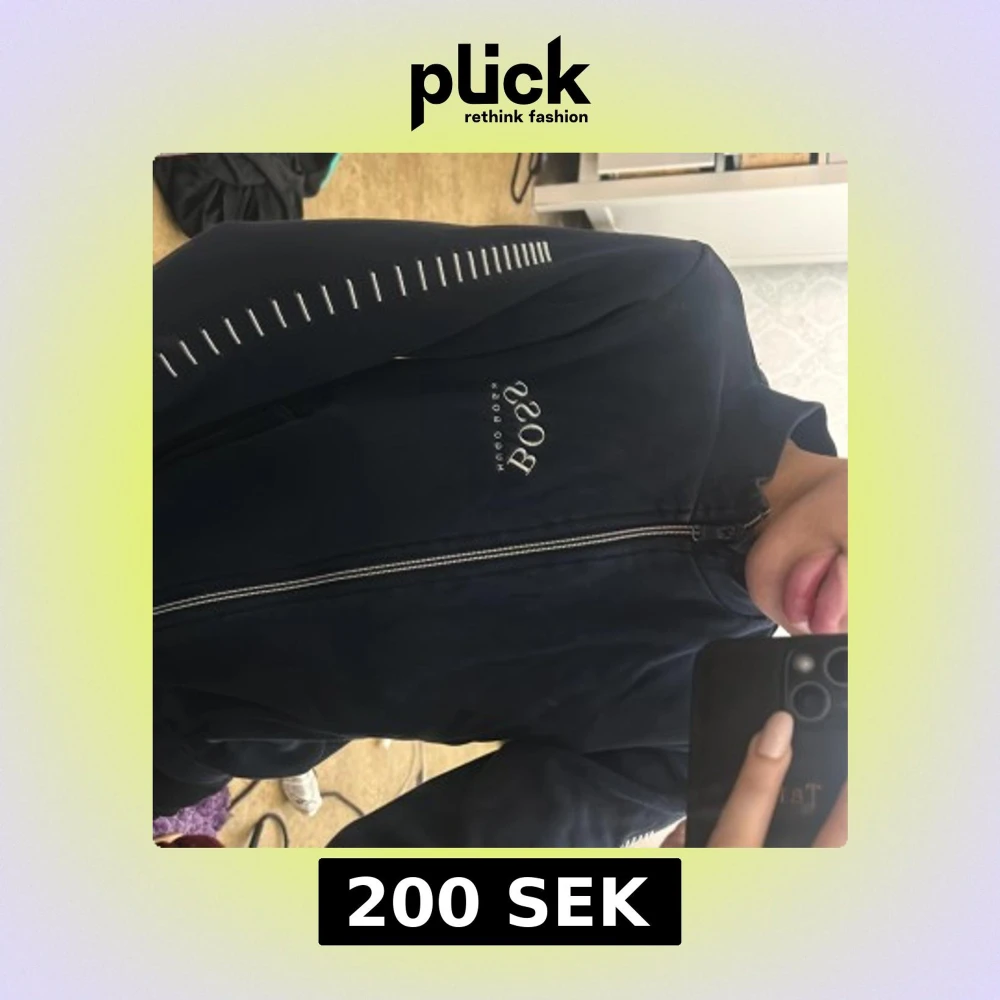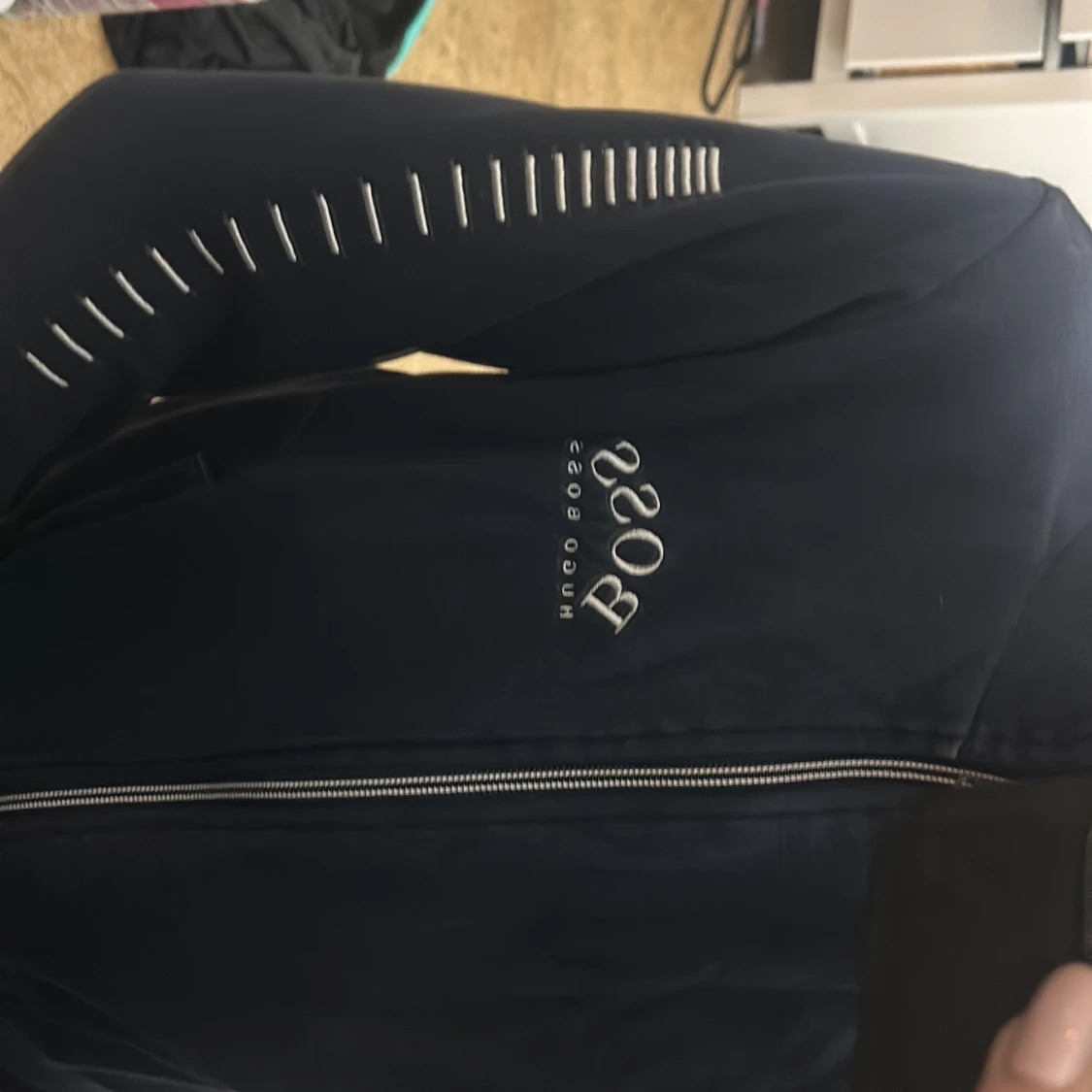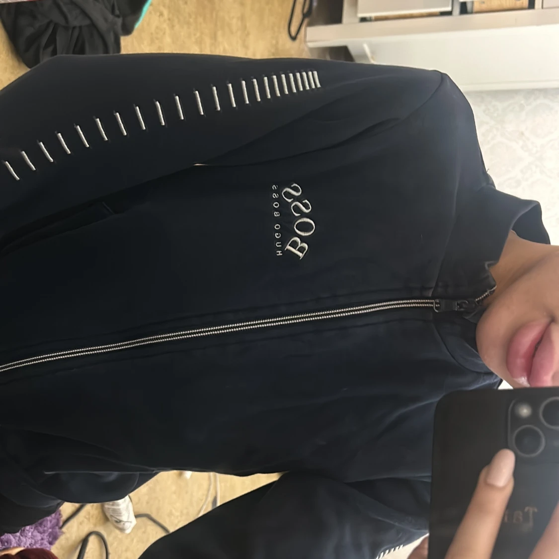 Marinblå hoodie från Hugo Boss med dragkedja framtill och diskret logga på bröstet.