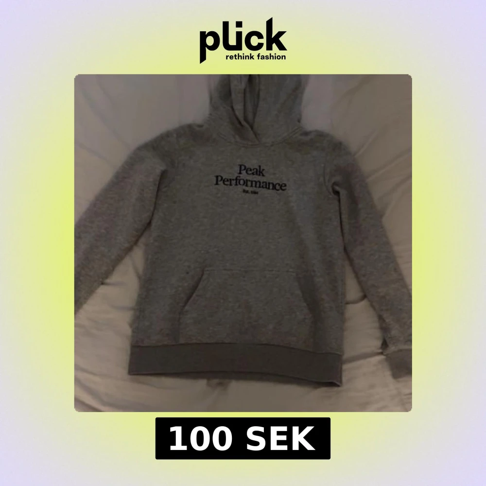 Säljer en grå hoodie från Peak Performance med svart logga på bröstet då den inte passar mig längre. Perfekt för chill dagar eller när du vill ha en enkel och snygg look. Skön och i bra skick. Sitter som storlek S