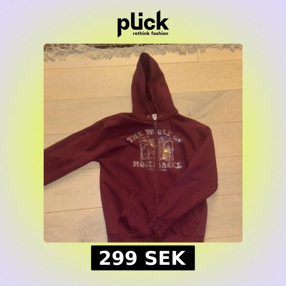 En One of One zip up hoodie med vinröd färg i storleken medium. Några av stenarna som sitter på tröjan har lossnat i tvätten men det är inget som syns om man inte kollar noga. Bör tvättas ut och in för att dom inte ska lossna lika lätt.