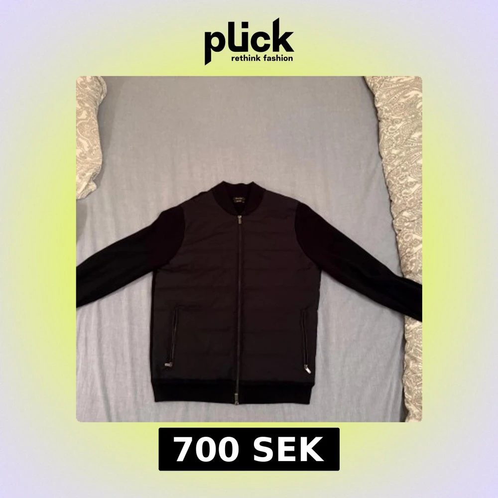 Snygg svart cardigan från Massimo Dutti med dragkedja framtill och ribbade muddar. Jackan har långa ärmar och två fickor med dragkedja. Perfekt för en stilren look. Använt ett fåtal gånger men ser ut som ny. Den är för stor för mig som ni ser på bilden då jag brukar ha M