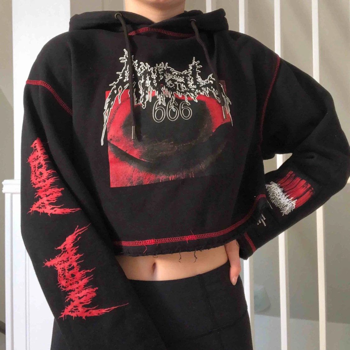 Croppad hoodie med snyggt tryck i storlek S men som även passar dig som bär XS. Mycket bra skick. Du som köpare står för frakt ❤️