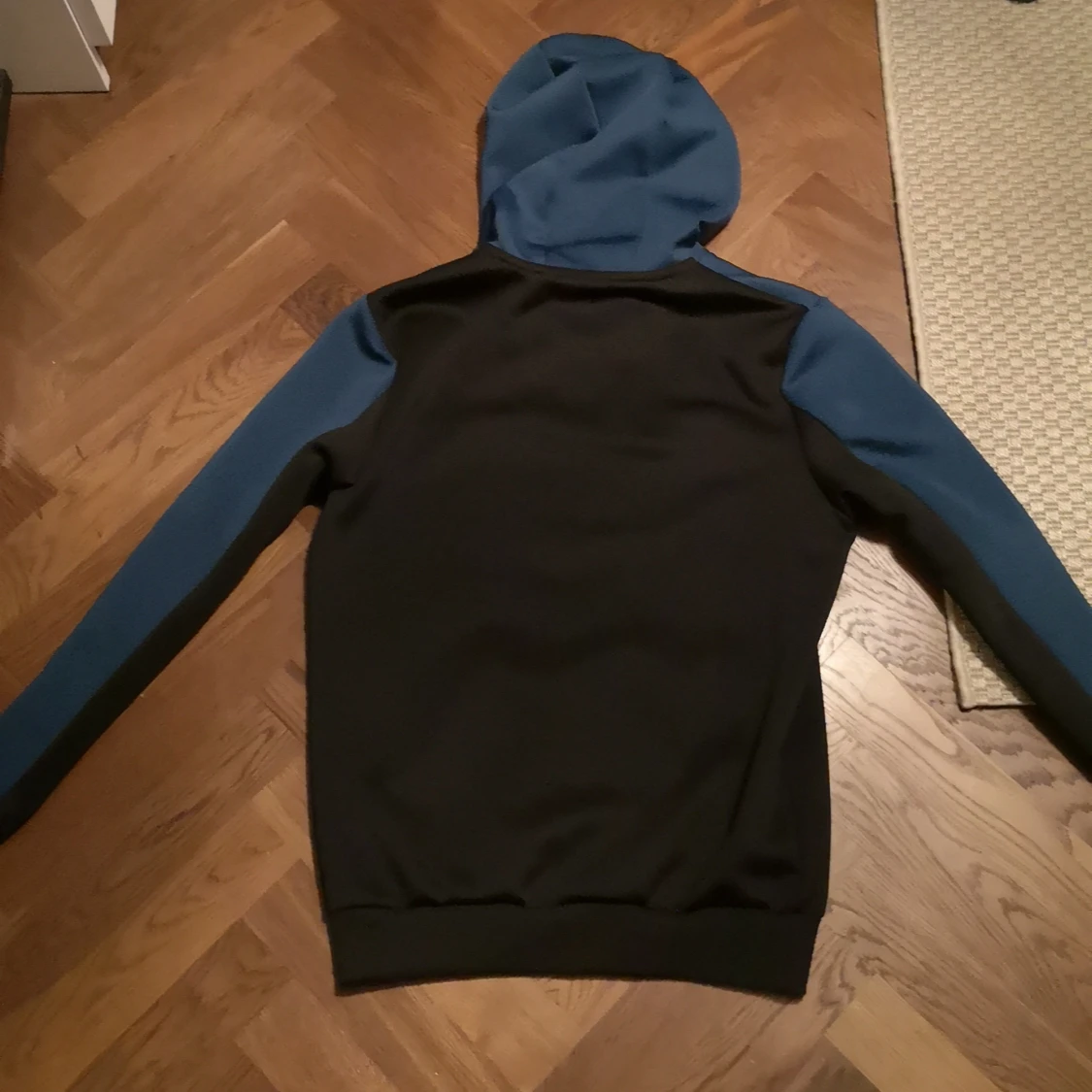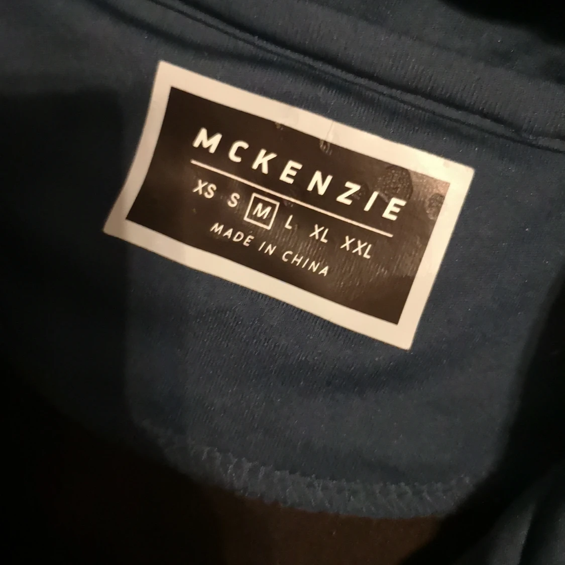 Säljer en snygg hoodie från McKenzie i svart och mörkblått med vit detalj över bröstet. Tröjan har huva, dragkedja och långa ärmar. Perfekt för chill dagar eller när du vill ha en sportig look. Materialet är mjukt och känns skönt mot huden.