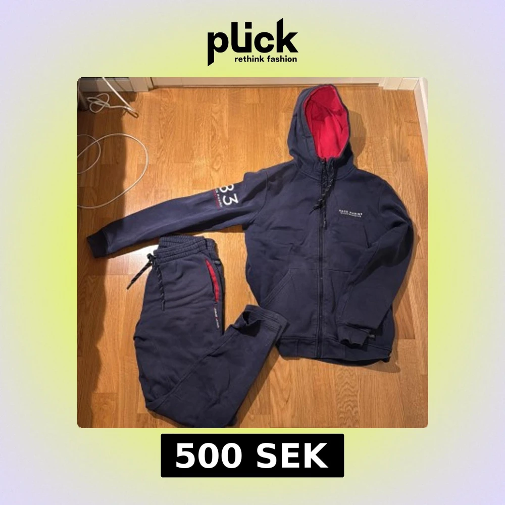 Säljer en mörkblå hoodie med dragkedja och matchande byxor från Race Marine. Ny pris 1000krHoodien har en röd insida i huvan och broderad text på ärmen. Byxorna har snörning i midjan och röda detaljer vid fickorna. Priset kan alltid diskuteras!.