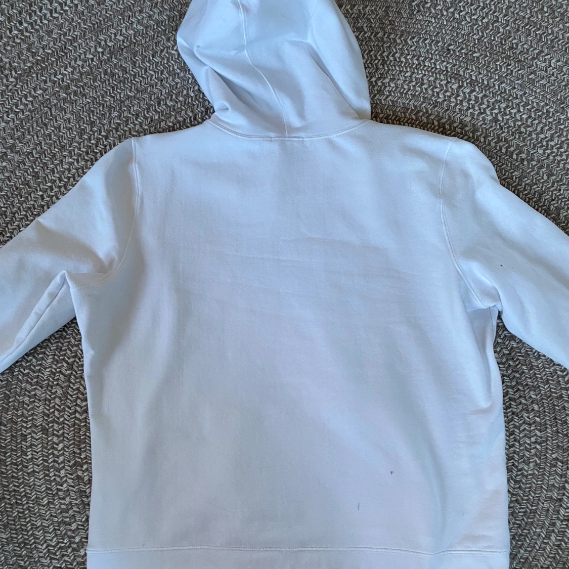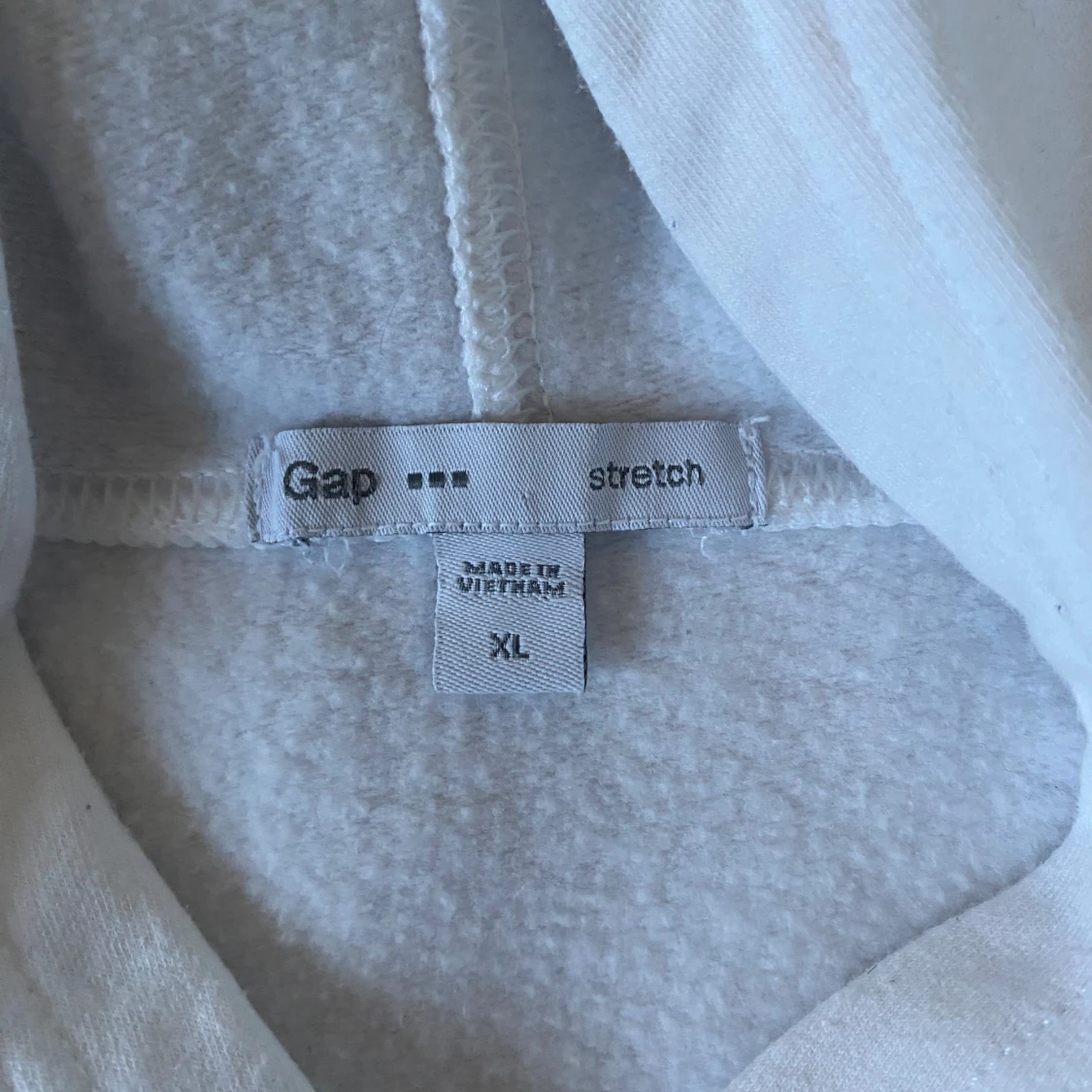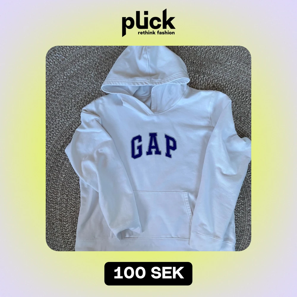 Säljer en vit hoodie från GAP. På lappen står det XL, men den passar S/M. Den har en klassisk design med GAP-loggan i blått på framsidan. Perfekt för en avslappnad stil och passar bra till både höst och vår. Hoodien är i bra skick med en mjuk insida för extra komfort. Den har ett litet hål som man kan se på sista bilden, men det är inget som syns när man har på sig den