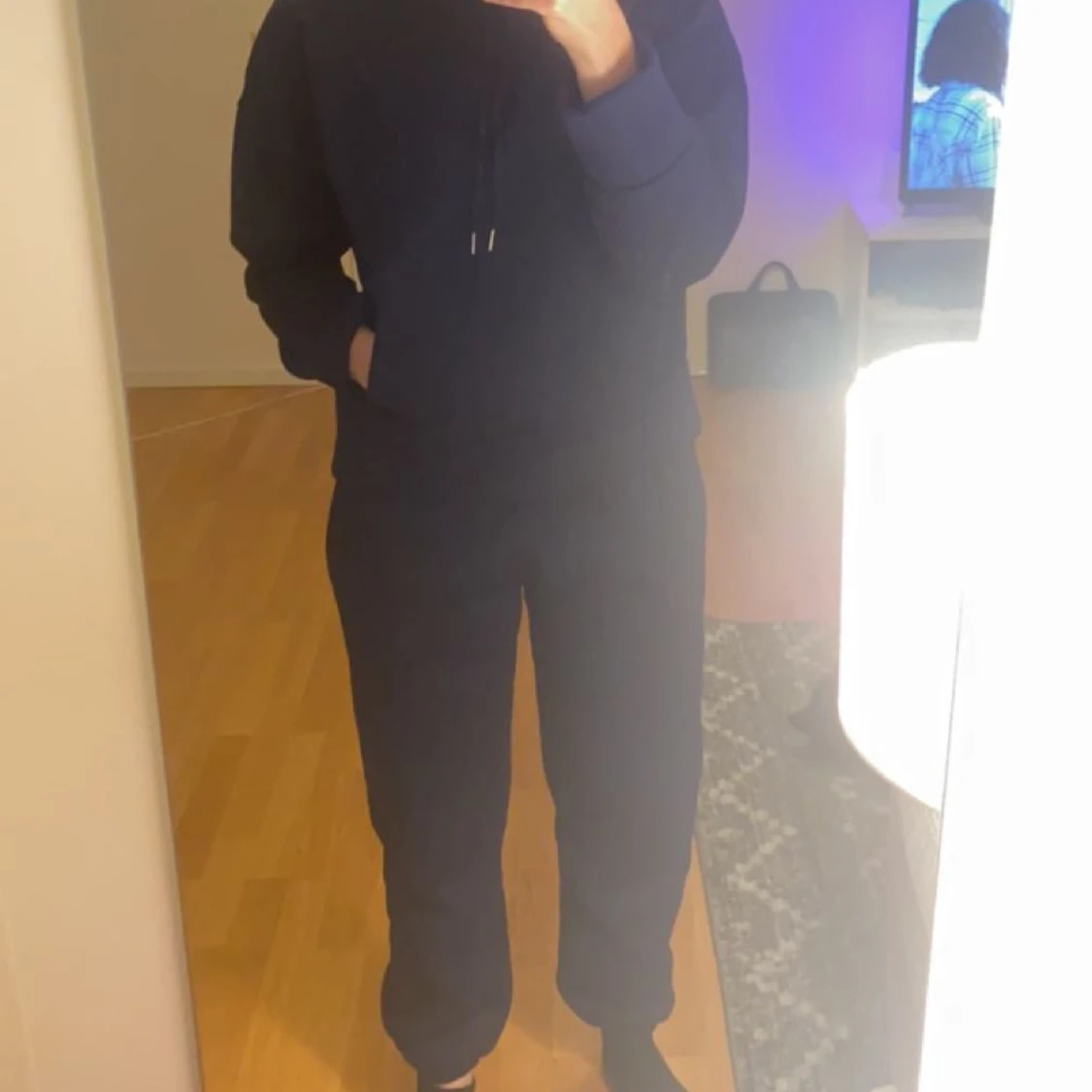 100 för både byxorna och huddien Mörkblå set ( mjukis byxor/huddie) Endast provat , skön o varm i materialet. Storlek M men passar S
