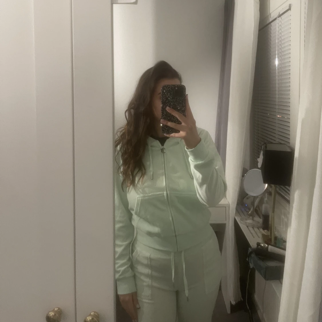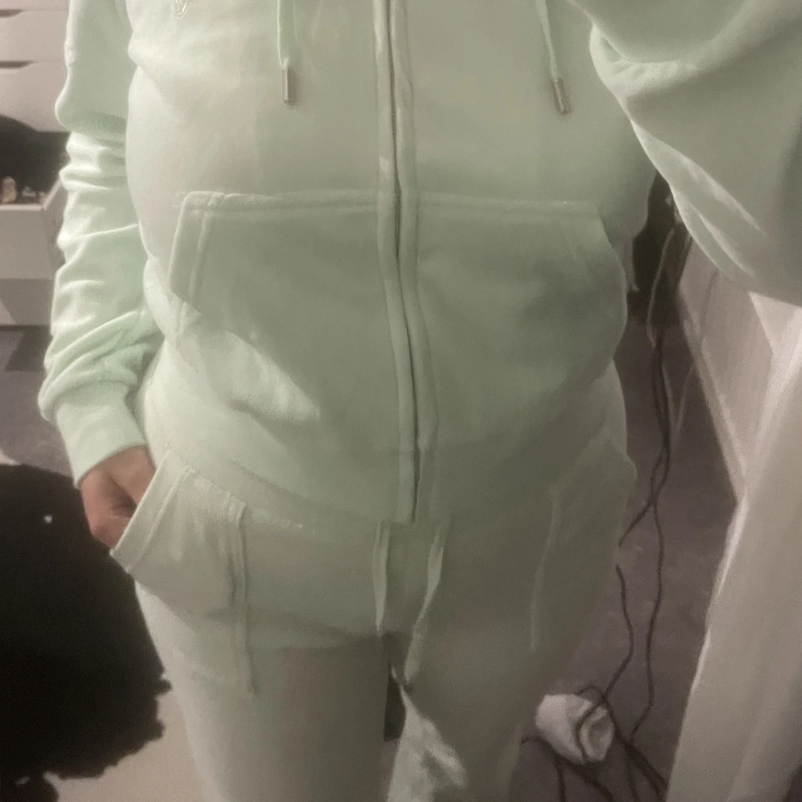 Ett neongrönt mjukisset från Juicy i materialet cotton rich. Koftan aldrig använd strl M. Byxorna använda några gånger och har tappat lite färg samt fått en liten brun fläck strl S. Köpt för 1500kr säljer för 700kr.