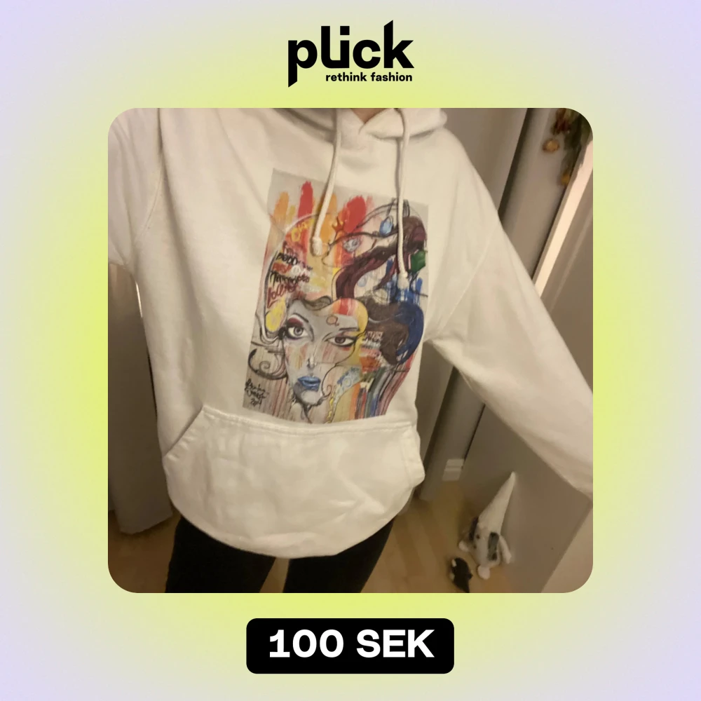 Säljer en vit hoodie med ett färgglatt och konstnärligt tryck på framsidan. Hoodien har en stor ficka framtill och justerbara snören i huvan.💕