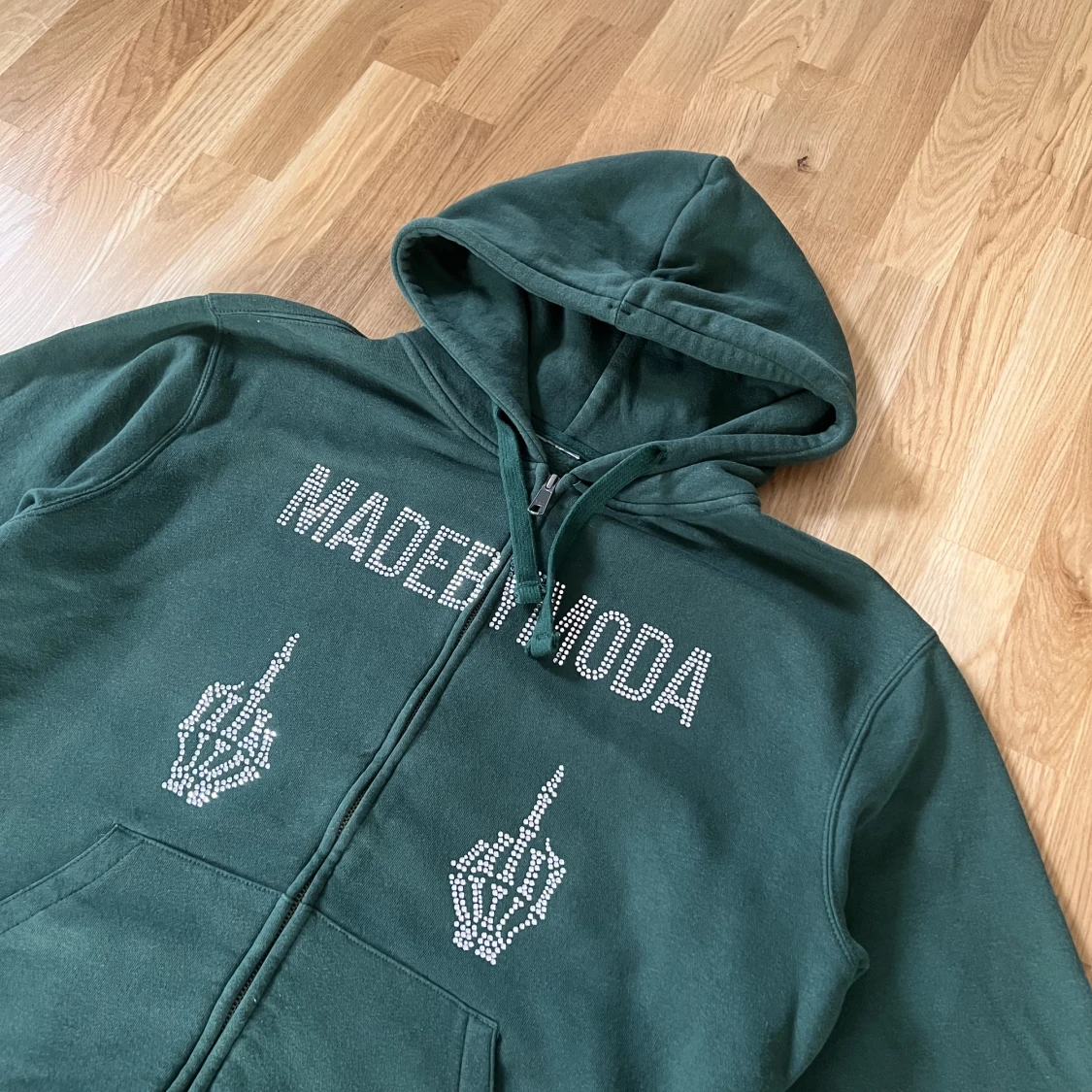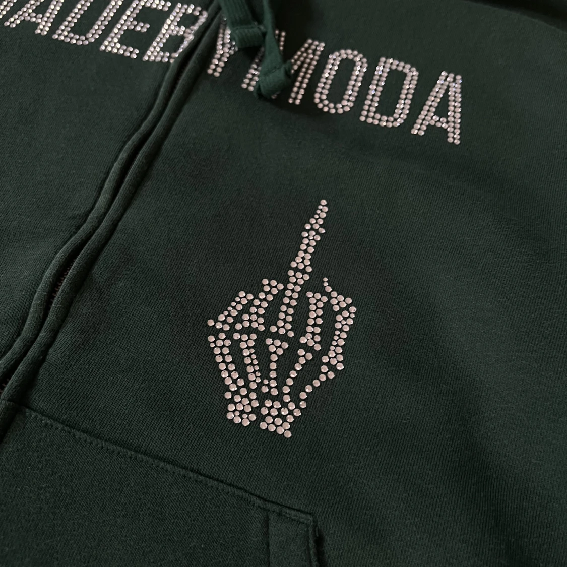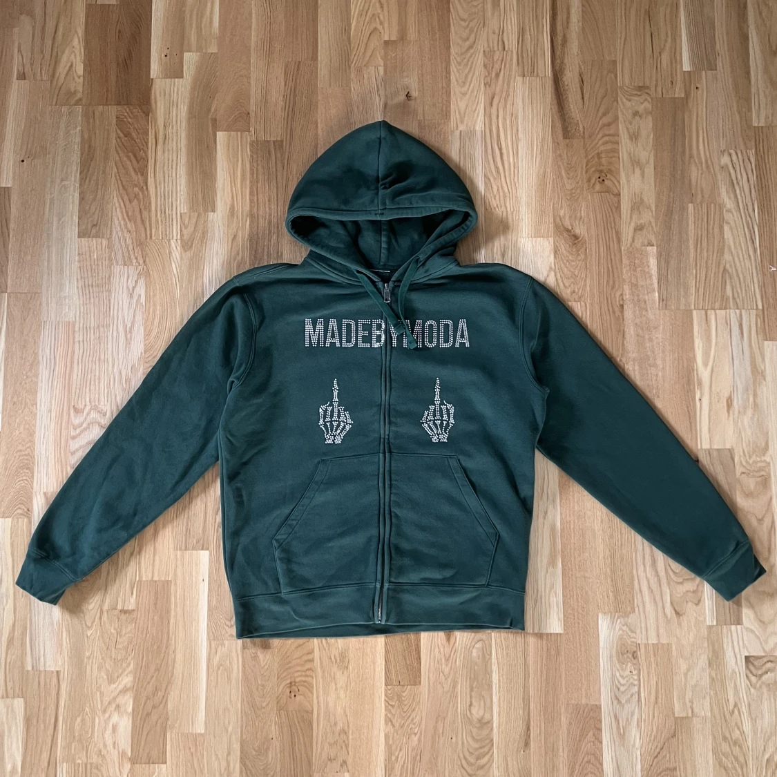 MADEBYMODA rhinestone F-YOU hoodie grön, finns 3st i storlek large. Finns även att köpa på madebymoda.com (vår hemsida).