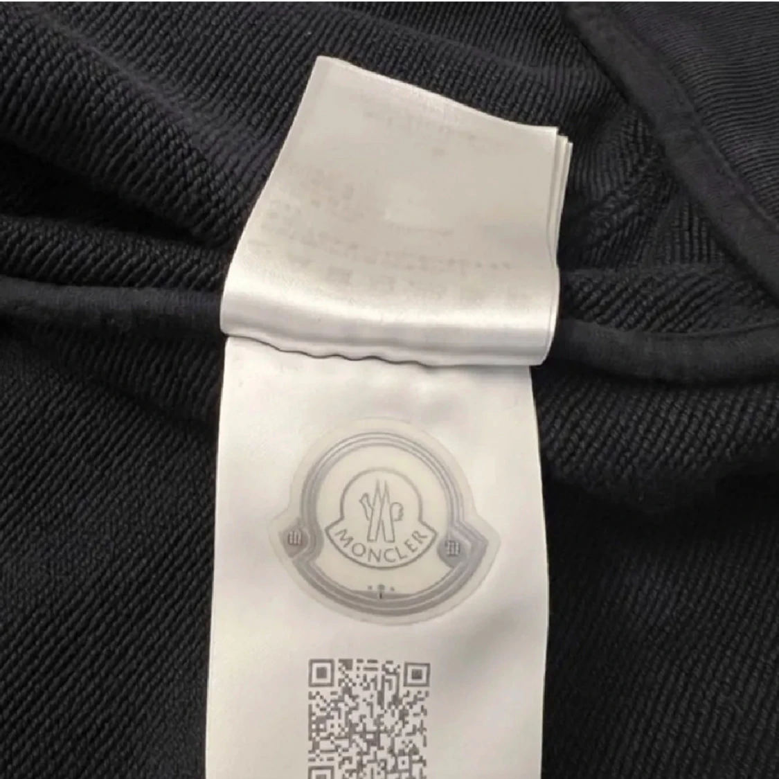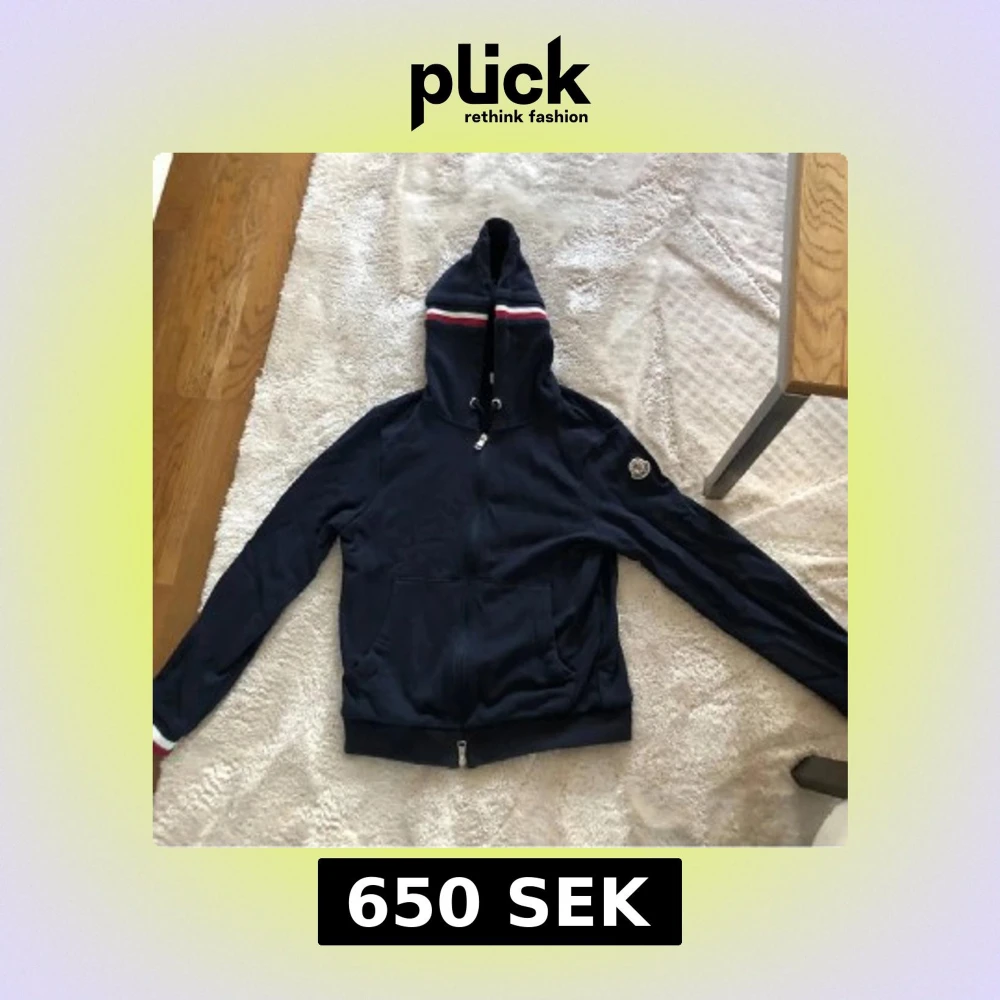 Säljer en mörkblå hoodie från Moncler med dragkedja och huva. Tricolore-detalj på huvan och logotyp på ärmen. Perfekt för en sportig och stilren look. Fickor framtill och ribbade muddar. Helt ny skick nästan