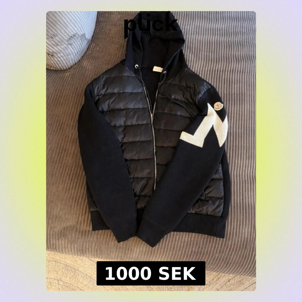 Snygg svart pufferjacka med huva och dragkedja. Jackan har stickade ärmar och ribbade muddar, samt ett vitt zigzag-mönster på ena ärmen och logga på axeln. Kroppen är quiltad och vadderad för extra värme. Priset är absolut inte fast, skicka gärna prisförslag!