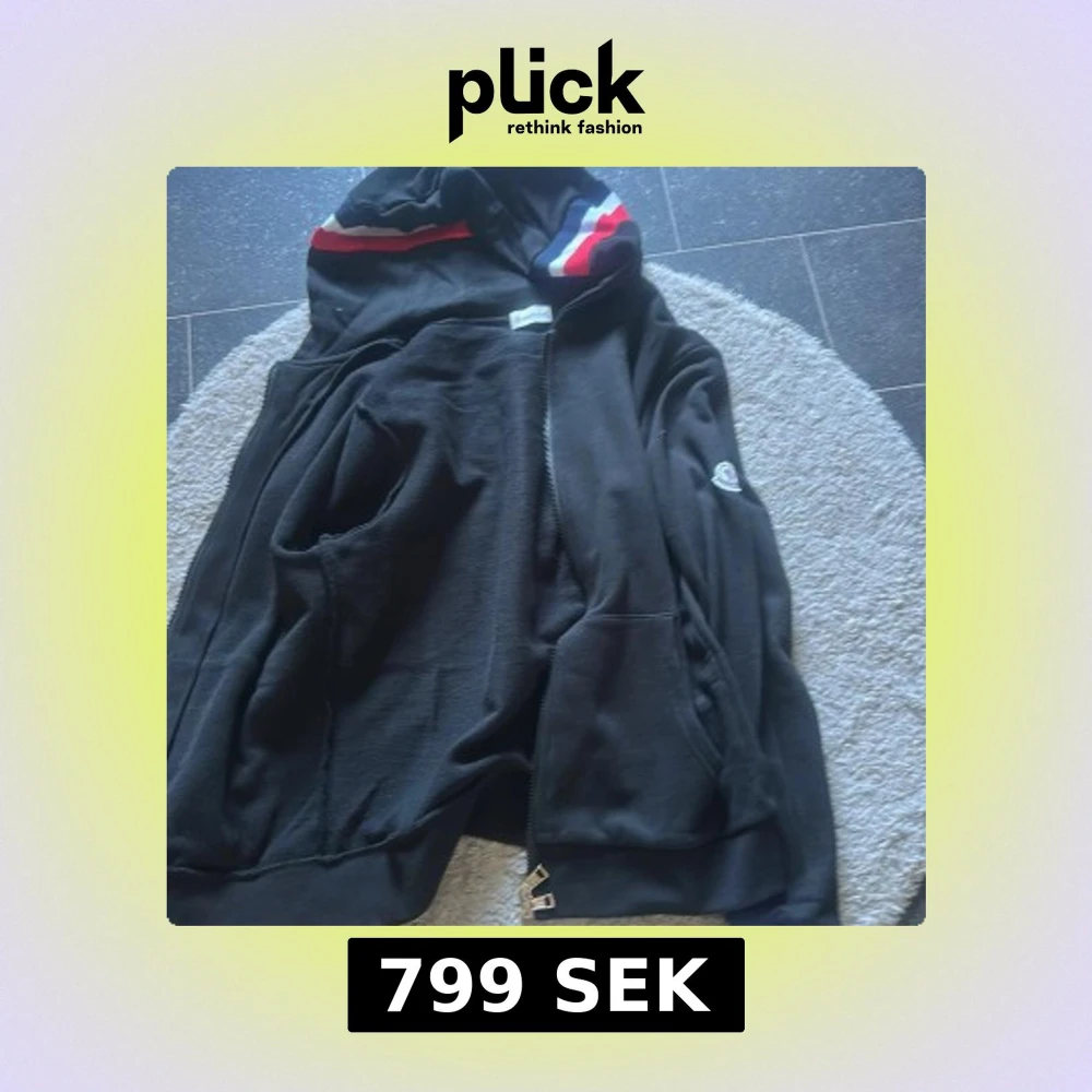 Svart hoodie från Moncler med hel dragkedja, fickor fram och huva med röd, vit och blå detalj. Klassisk Moncler-logga på ärmen. Tillverkad i mjuk bomull, perfekt för chill dagar eller när du vill ha en clean streetstyle-look.