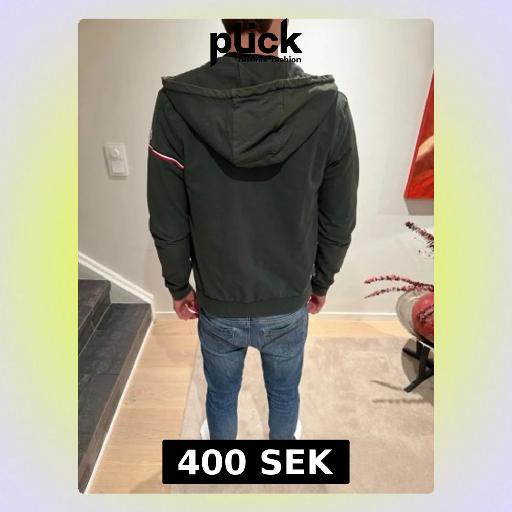 Snygg mörkgrön hoodie från Moncler med dragkedja, huva och fickor framtill.