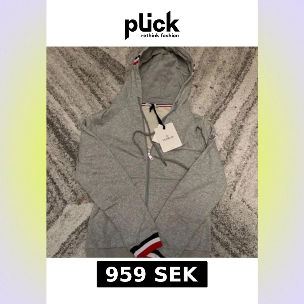 Snygg grå hoodie från Moncler med huva och dragkedja framtill. Tröjan har långa ärmar och ribbade muddar med röd, vit och marinblå rand. Moncler-logga på ärmen och snörning i huvan. Perfekt för chill dagar och streetstyle.