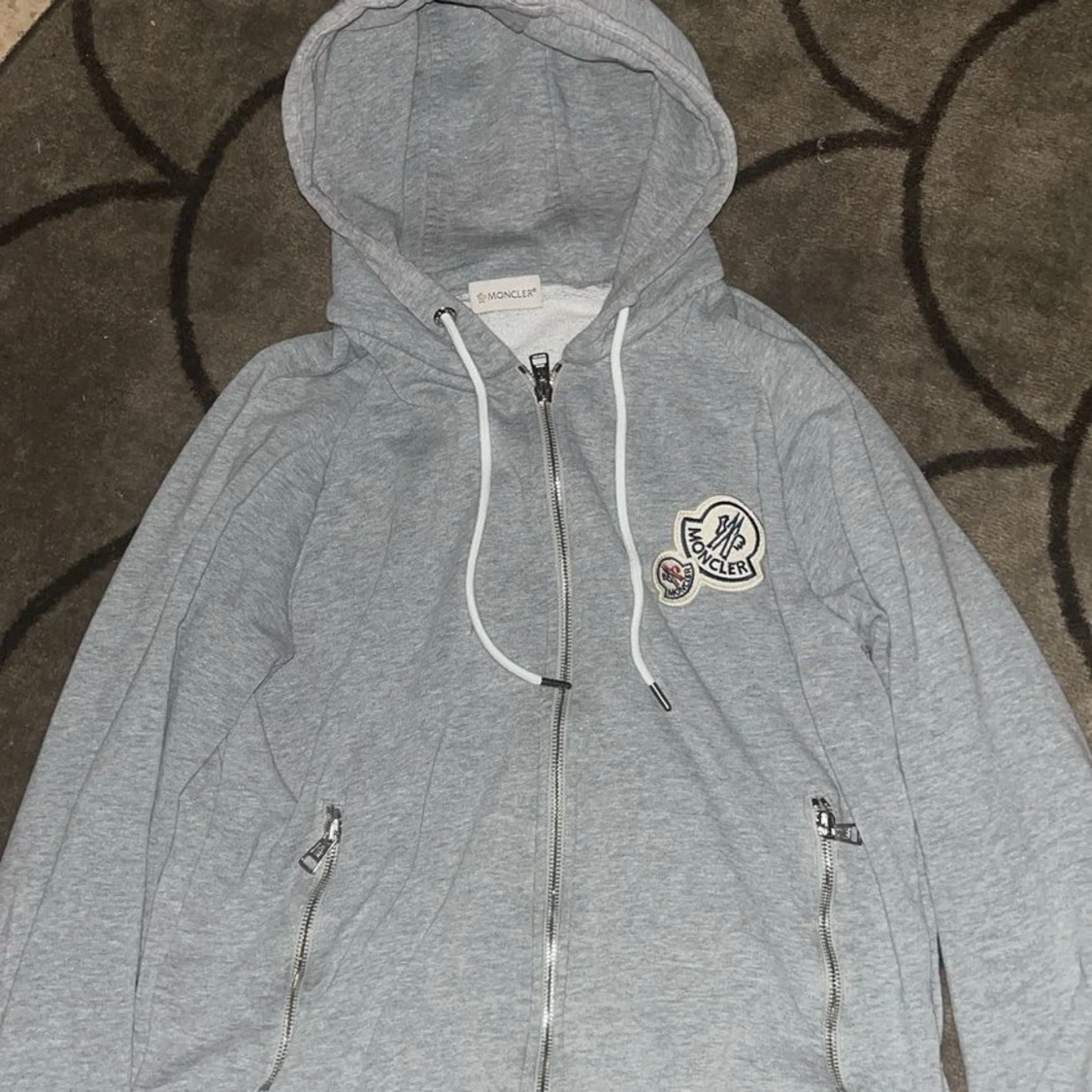 Snygg grå hoodie från Moncler med vit dragsko och dragkedja framtill. Tröjan har två fickor med dragkedja och broderad Moncler-logga på bröstet. Mjuk insida och huva för extra komfort. Perfekt för chill dagar eller när du vill ha en clean streetstyle.