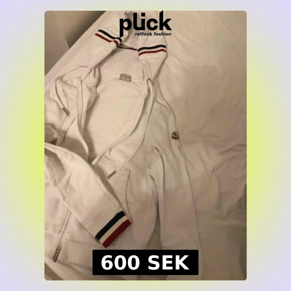 Säljer en vit hoodie från Moncler med dragkedja framtill och fickor på sidorna. Huva med dragsko och snygga ribbade muddar med röd, vit och marinblå rand. Moncler-logga på ärmen. Perfekt för dig som gillar exklusiv och stilren streetwear.