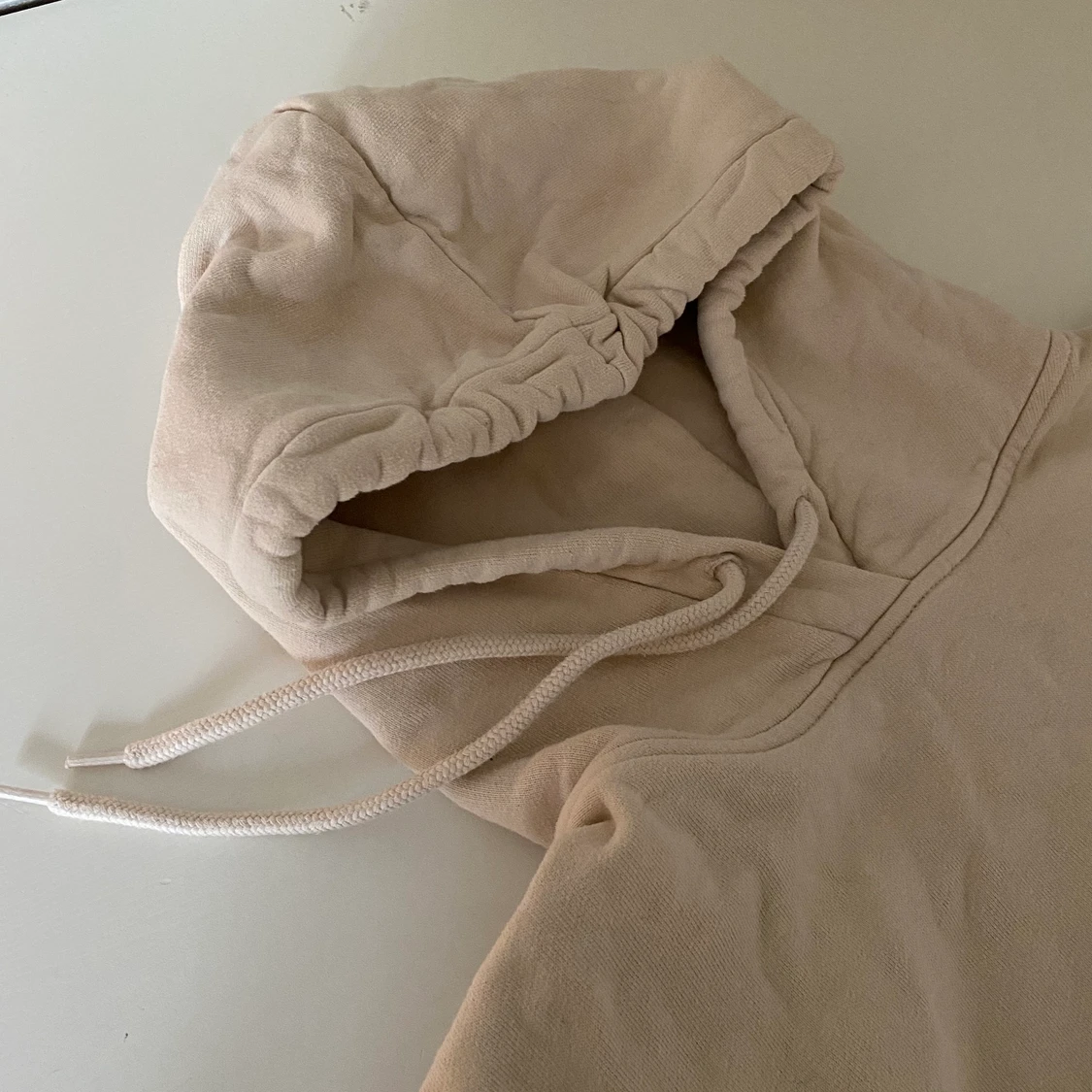 en beige hoodie som är oversized i modellen, strl XS men sitter som en L, köpare står för frakt
