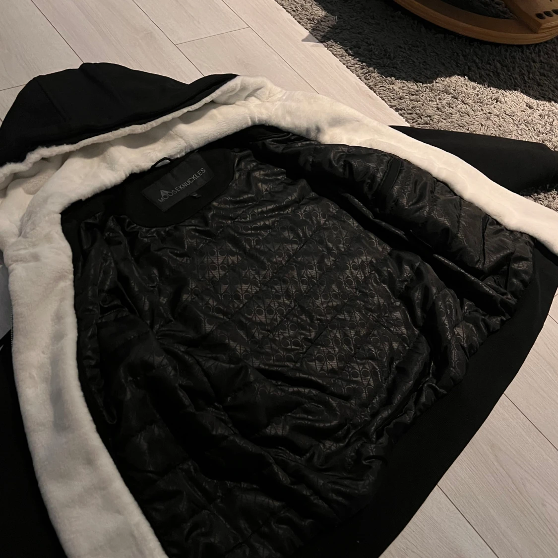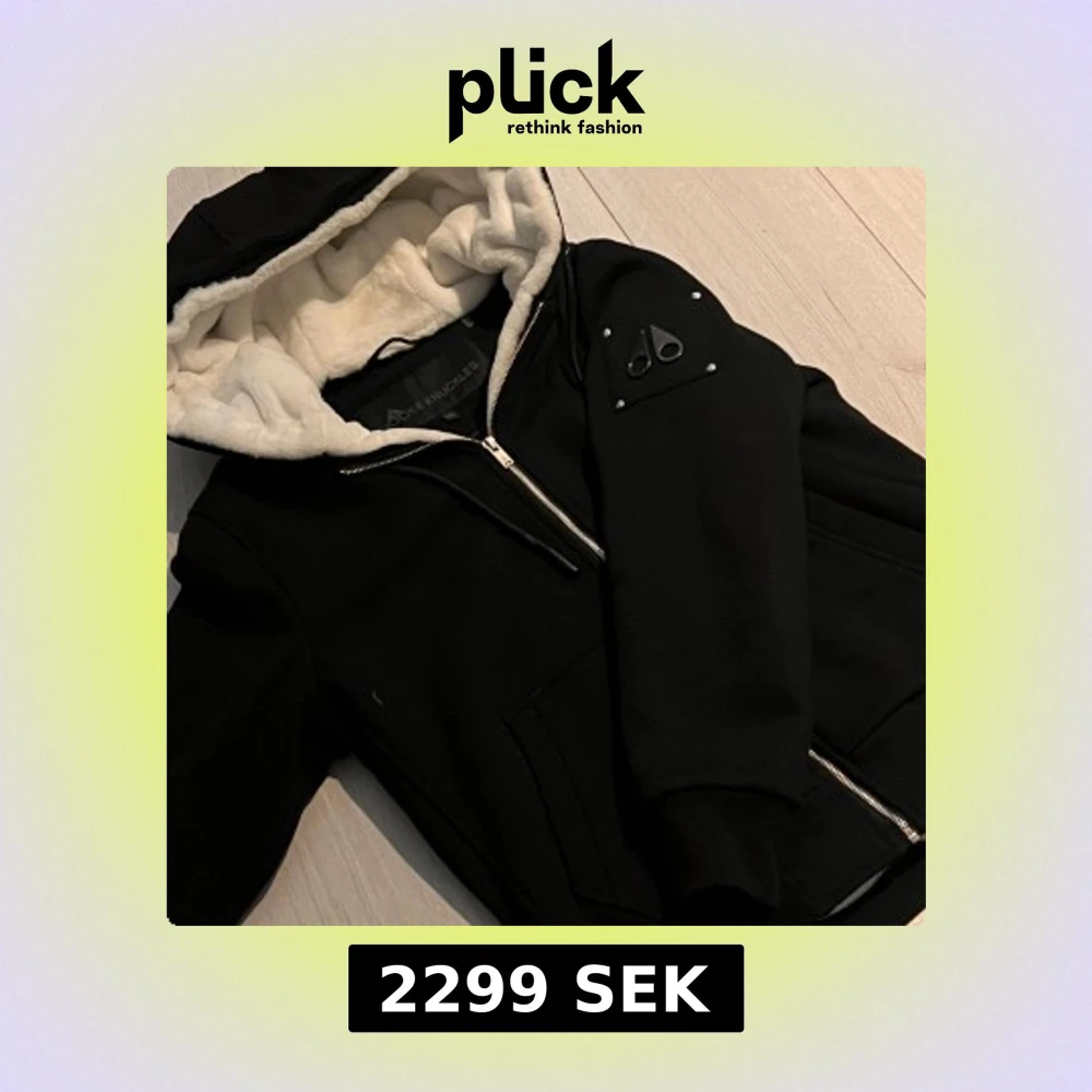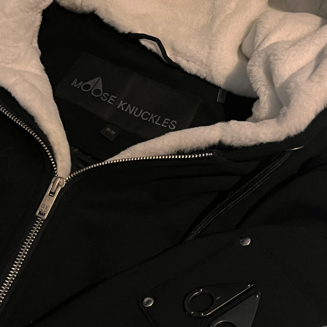 Svart zip från Moose Knuckles med vit fluffig huva och quiltat innerfoder. Jackan har dragkedja framtill, ribbade muddar och en snygg logotyp på ärmen. Perfekt för kalla dagar och har en riktigt skön vibe. Använd 2 gånger