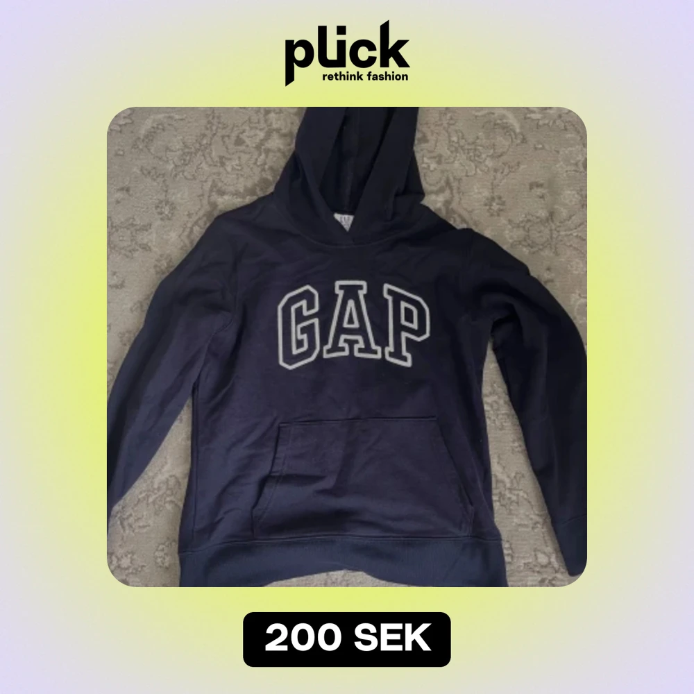 En mörkblå Hoodie från GAP, storlek XS, har bara kommit till användning en gång, Unisex, nypris 379kr men säljer för 200kr.