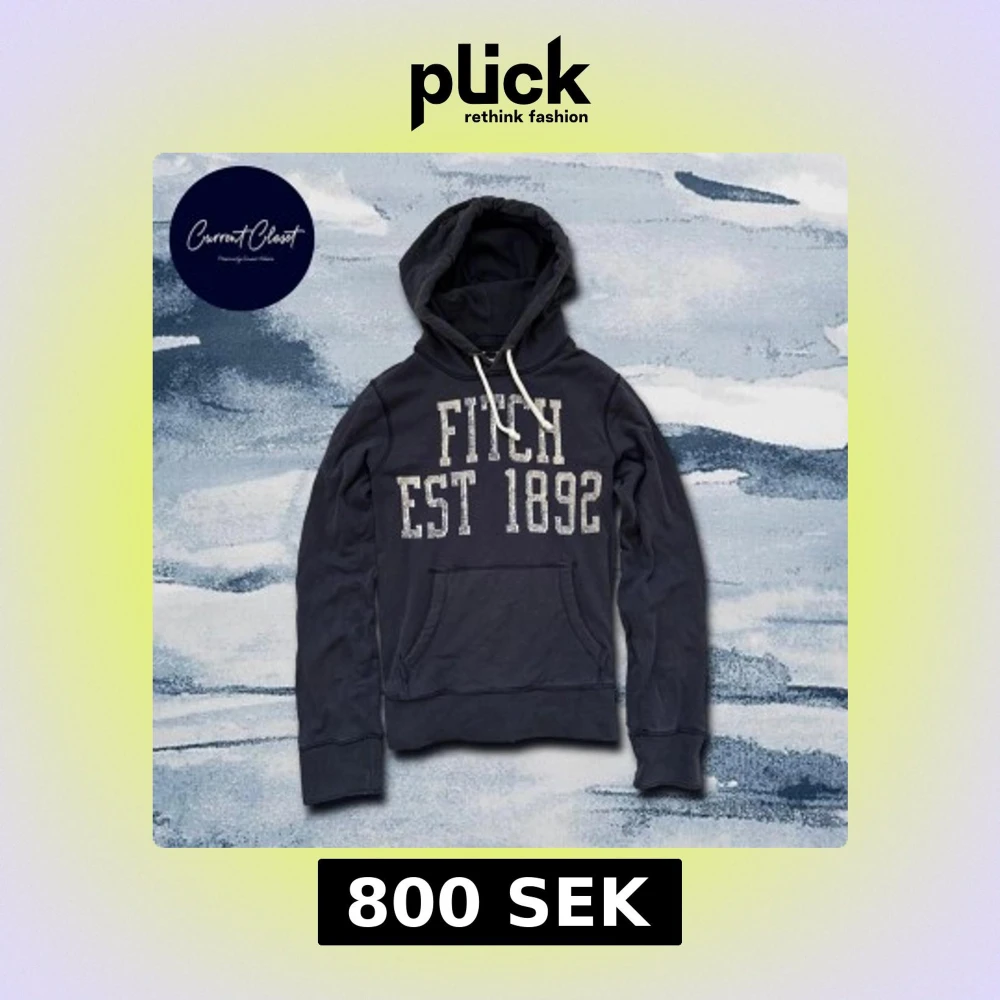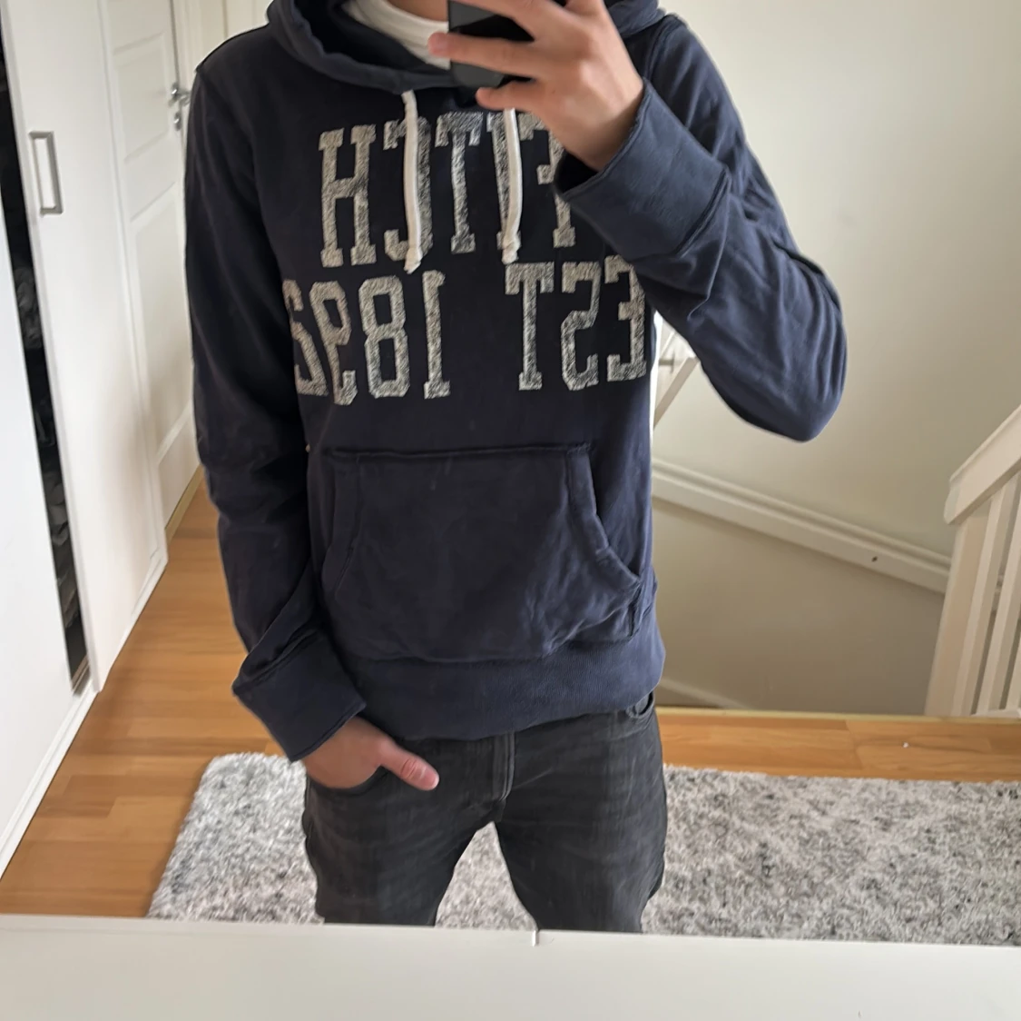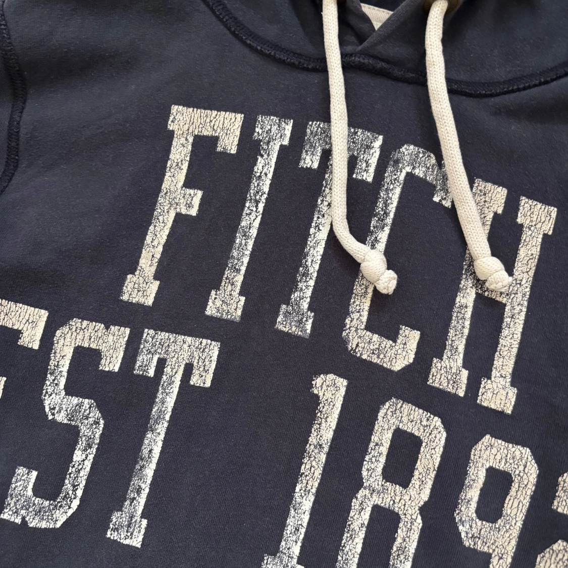 Snygg mörkblå hoodie från Abercrombie & Fitch med stor vit text 'FITCH EST 1892' framtill | Size S | Vintage och små slitningar förekommer | Svår att få tag på