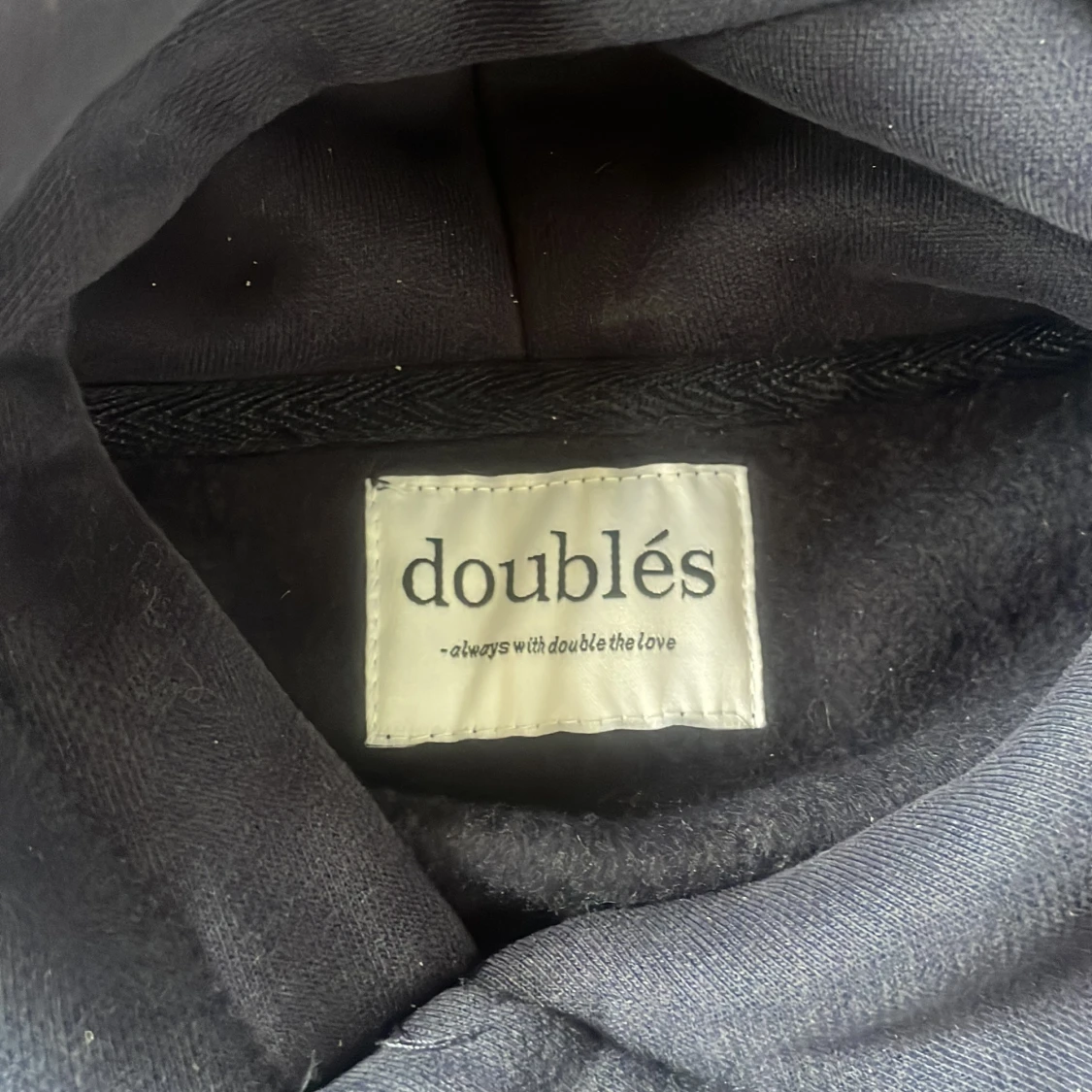 Säljer en stilren mörkblå hoodie från Doublés. Storlek xs. Endast testad! Super mjuk och skön