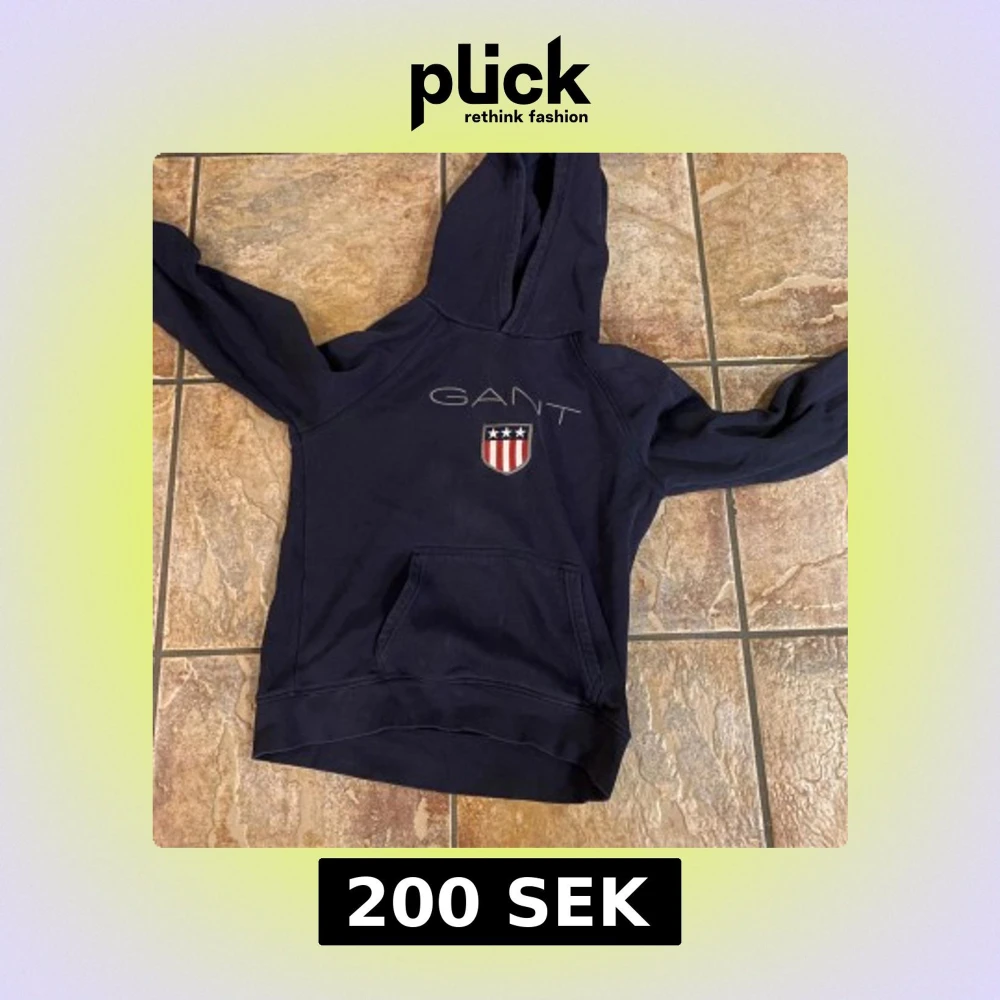 Säljer en snygg mörkblå hoodie från GANT med broderad logga och emblem på bröstet. Perfekt för en avslappnad stil med en stor ficka framtill och bekväm huva. Tröjan är 158/164