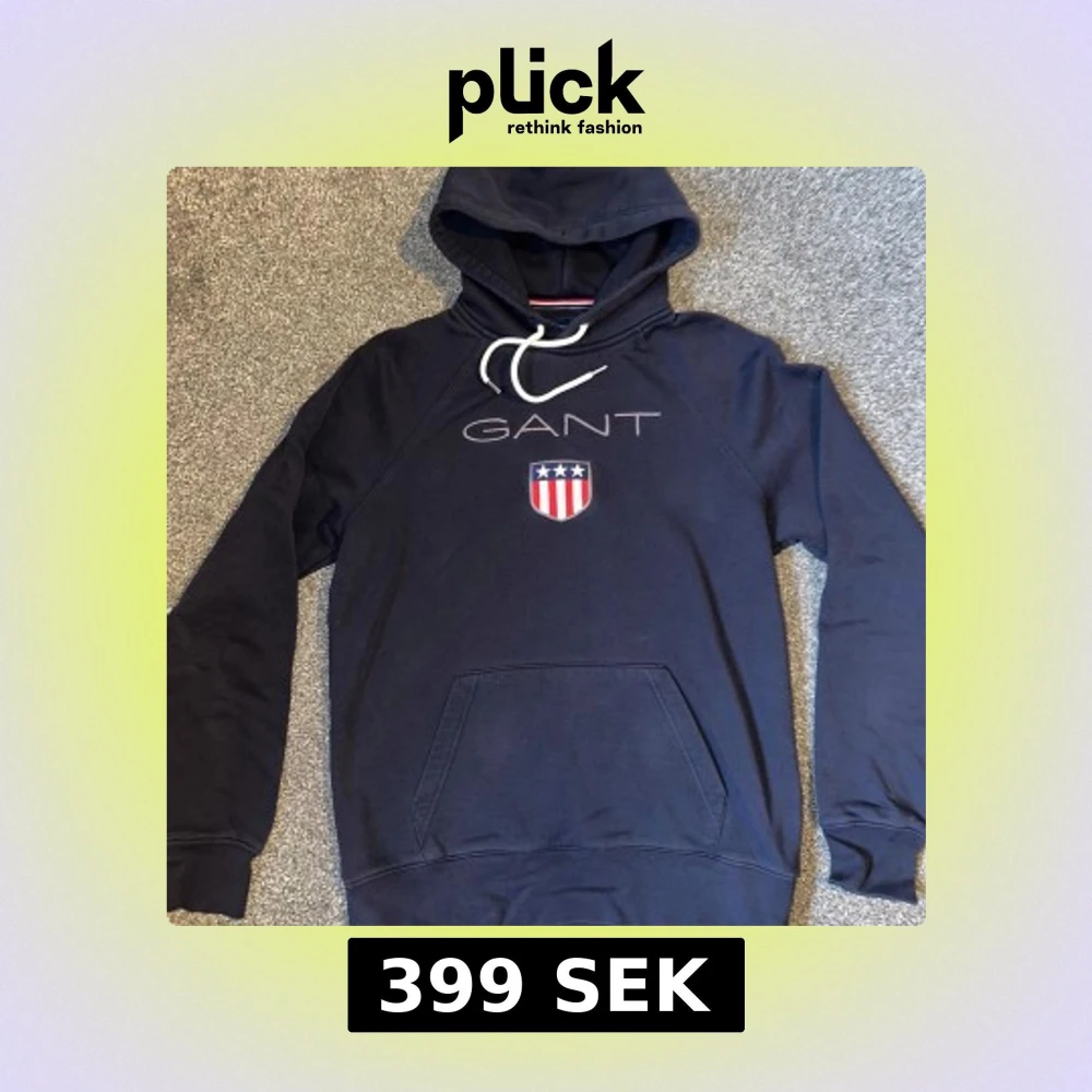 Säljer en snygg mörkblå hoodie från GANT med broderad logga och emblem på bröstet. Tröjan har en justerbar huva med vita snören och en stor ficka framtill. Perfekt för en avslappnad stil.
