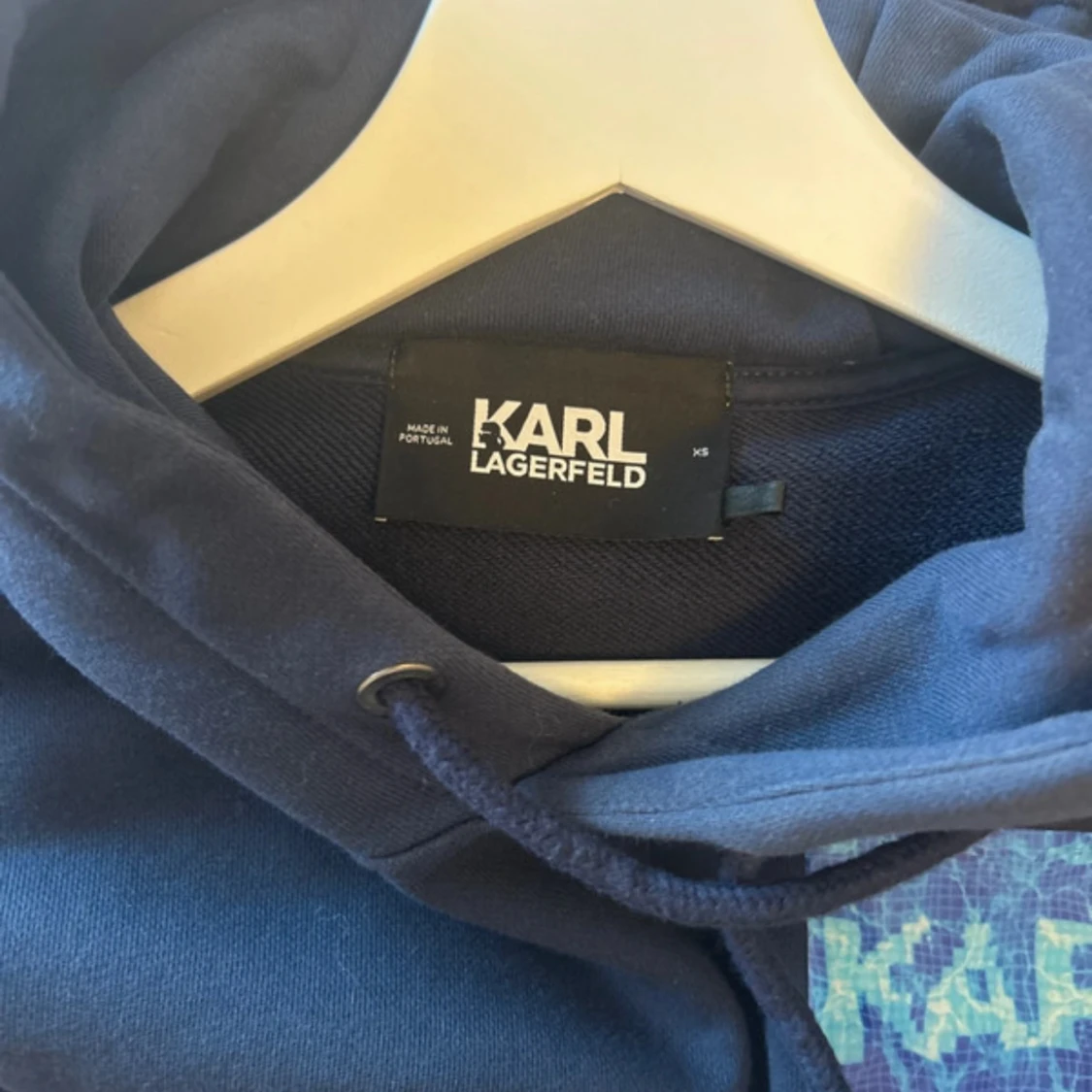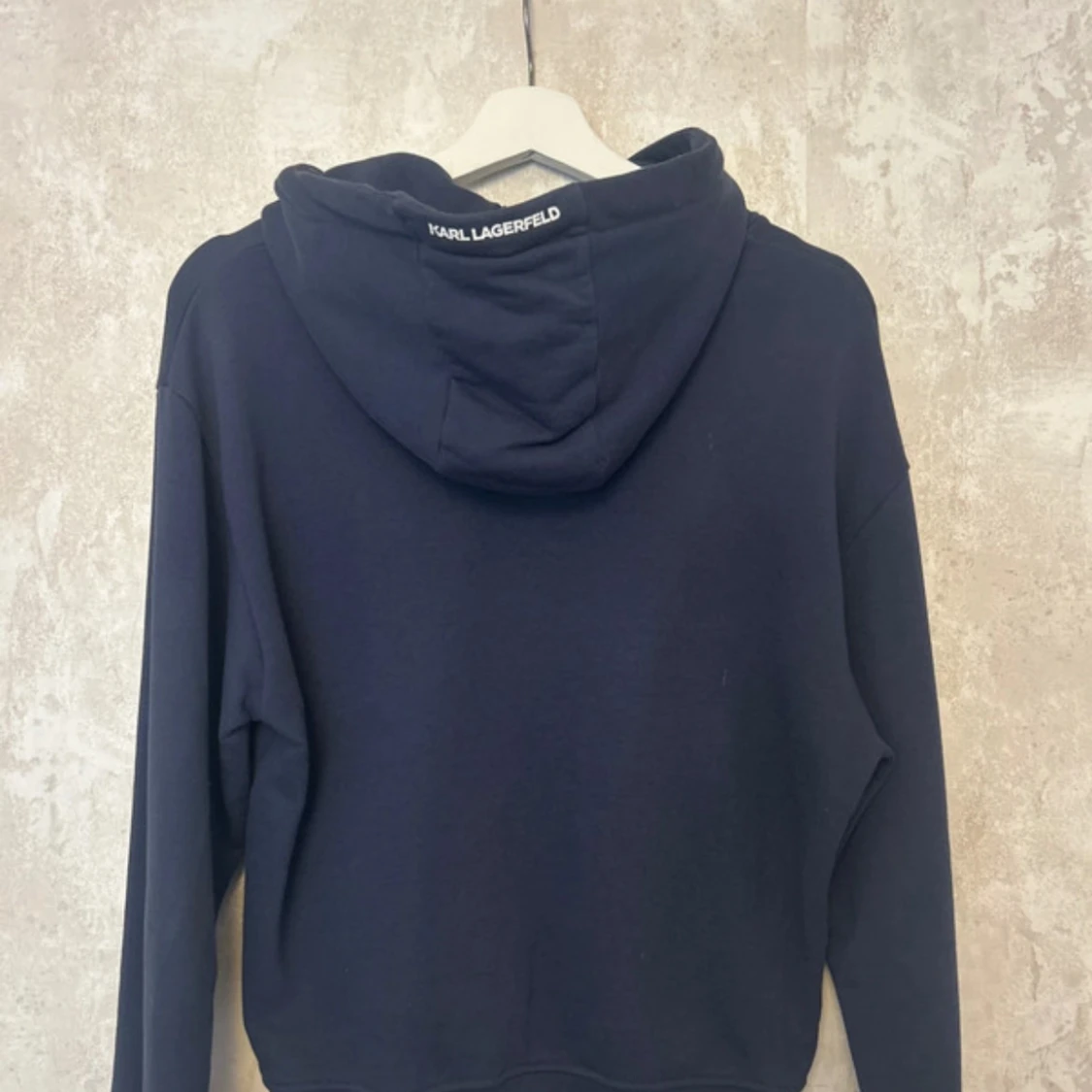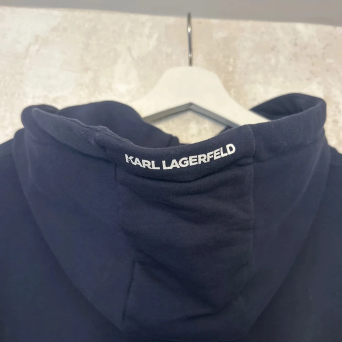 Snygg mörkblå hoodie från Karl Lagerfeld med huva och snörning. Framtill finns en blå patch med logga och en stor magficka. Diskret logotyp även på huvan. Perfekt för dig som gillar stilrena streetwear-plagg.